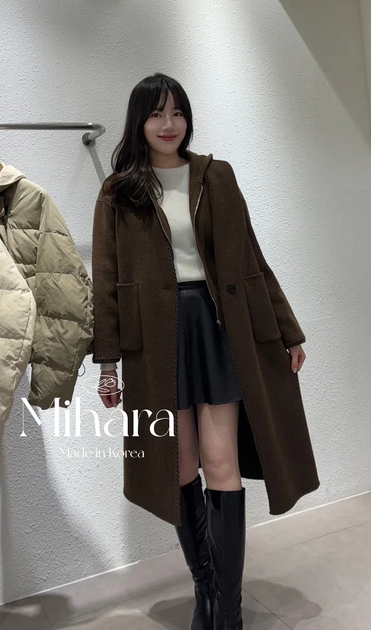 A260120(限量特)咖色70羊毛30羊絨連帽拉鍊背心+麻花滾邊大口袋手工開襟大衣