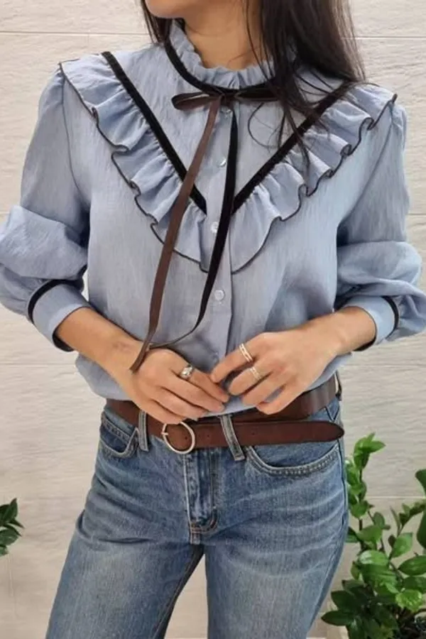 B213 0916蕾絲新廠家荷葉撞色滾邊上衣2色