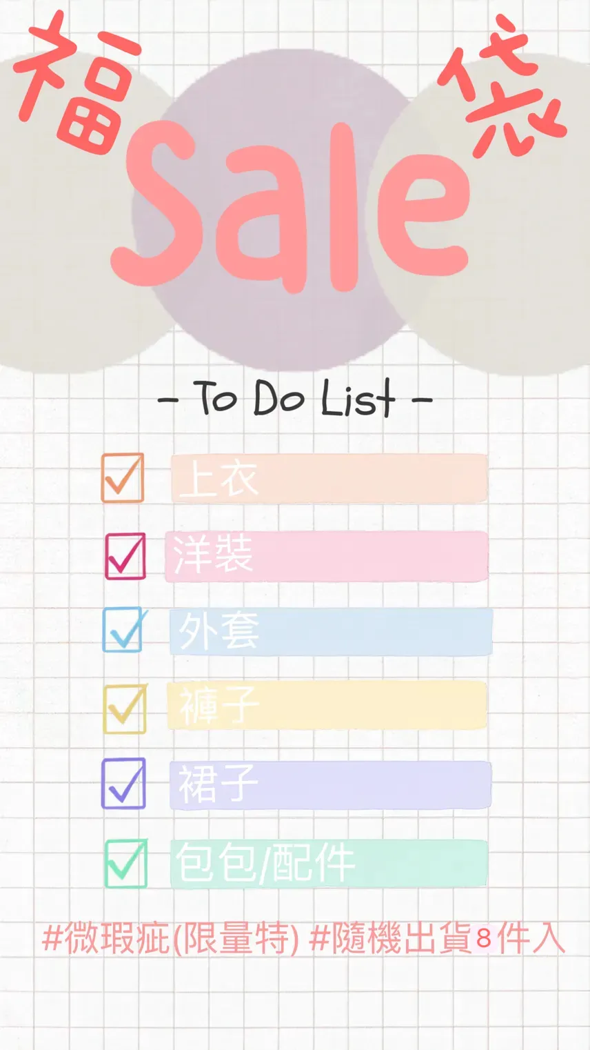 🎉春夏(限量特)新品+微微瑕疵品~超划算省荷包價~沒跟到就太可惜啦~福袋無併單;記得請幫我們立即完成付款☝️大部分商品都是放Free size可於備註:許願您要的尺寸小編會盡量幫您搭配❤️ 此特價商品已超低特惠價恕不接受退換貨。請能接受此規則的甜心才購買喔!謝謝您^_____^