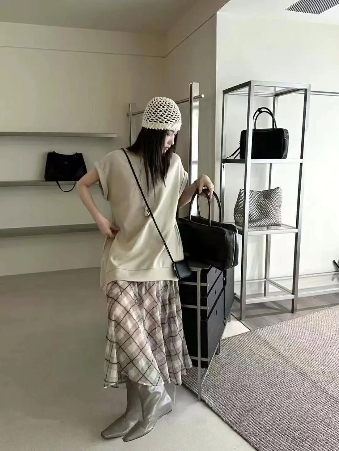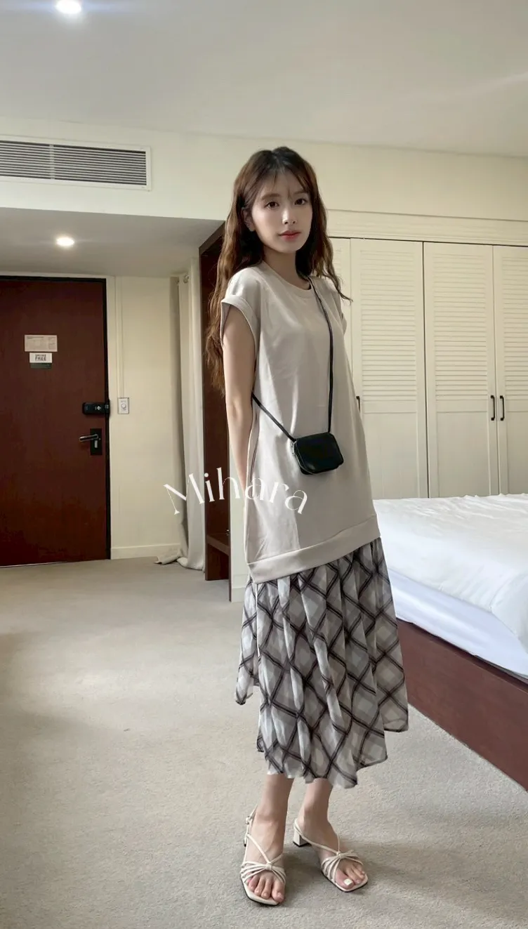 A19 0608(限量特)休閒棉質拼接雪紡格紋裙襬兩側雙口袋洋裝(無小包)