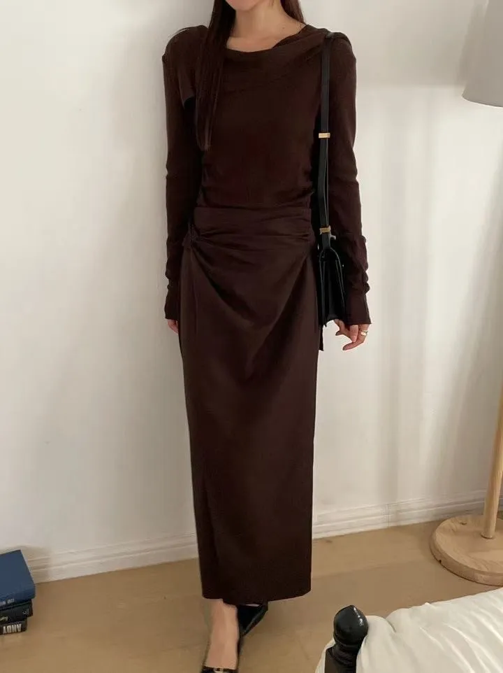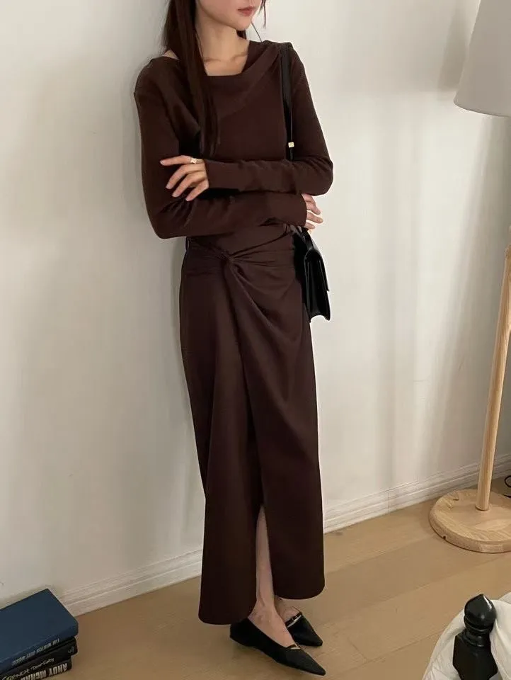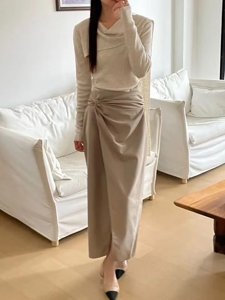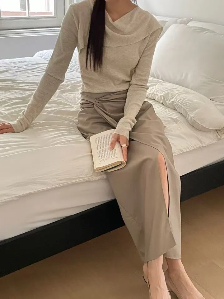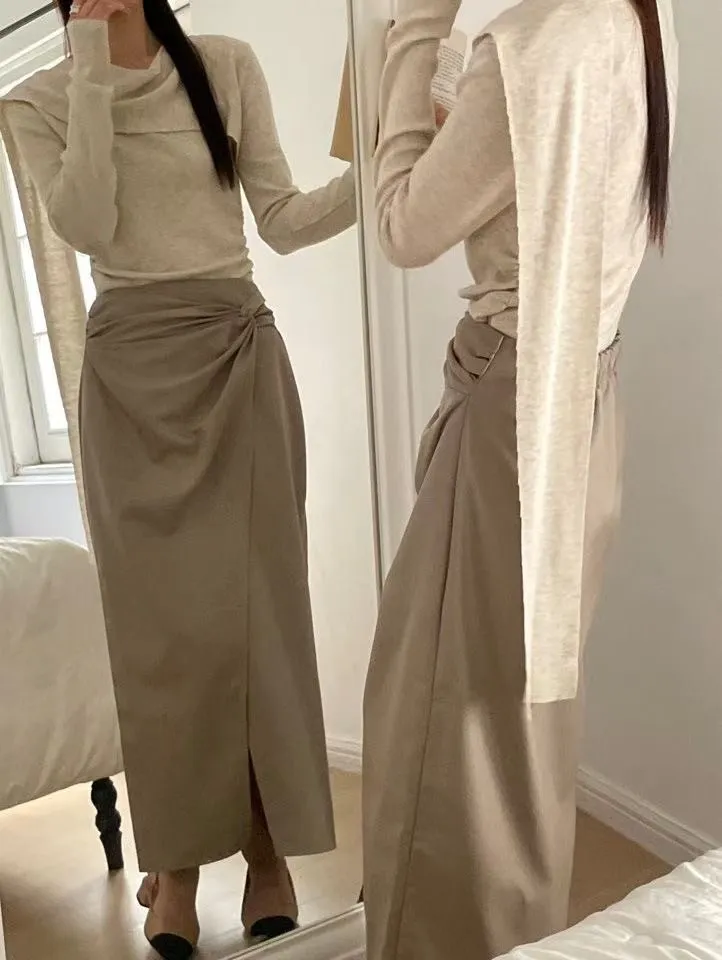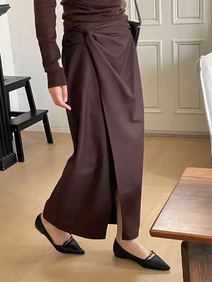 A39 0826高檔家前開衩側扭結人造絲半裙