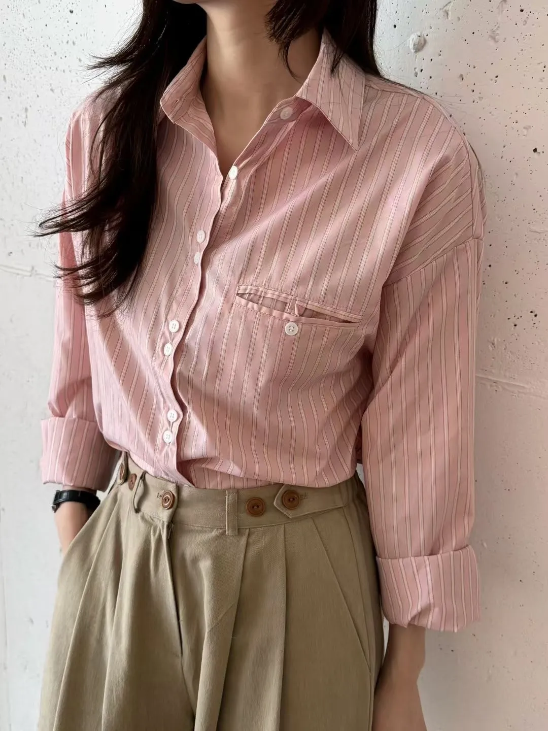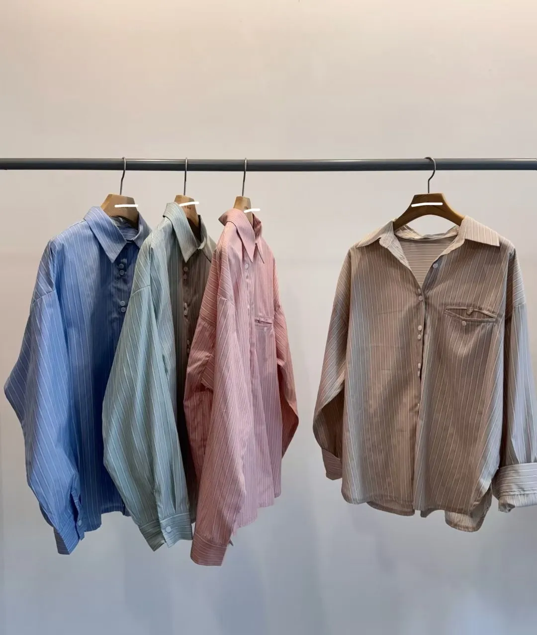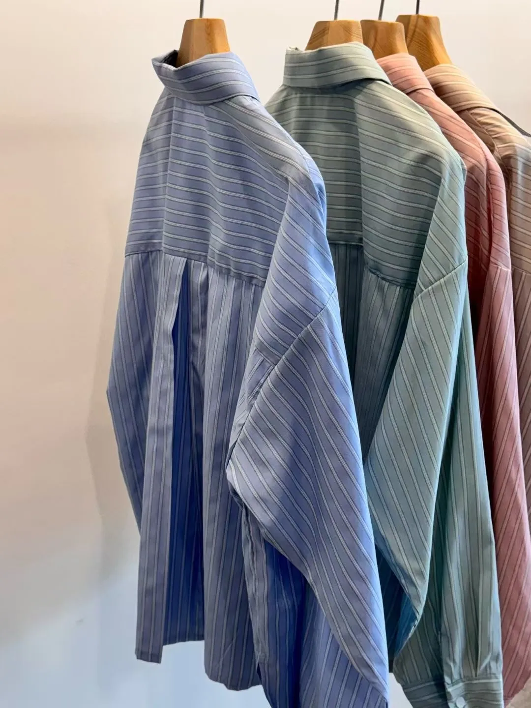A2 0906(限量特)設計感直條紋翻領排釦下擺圓弧剪裁襯衫4色