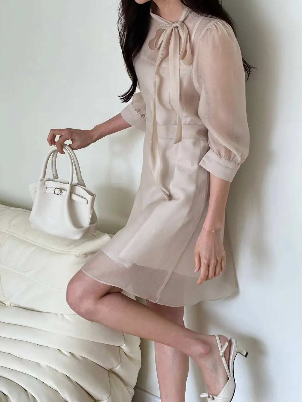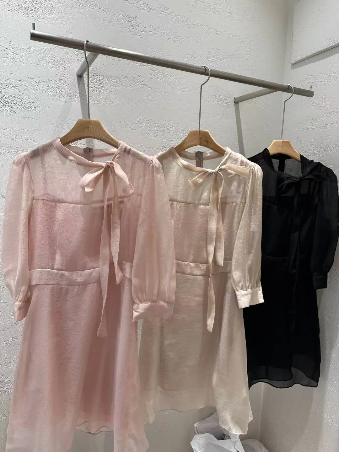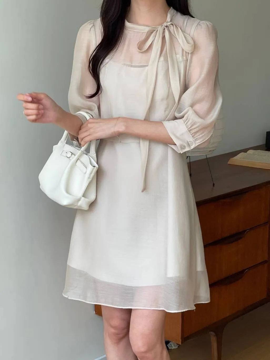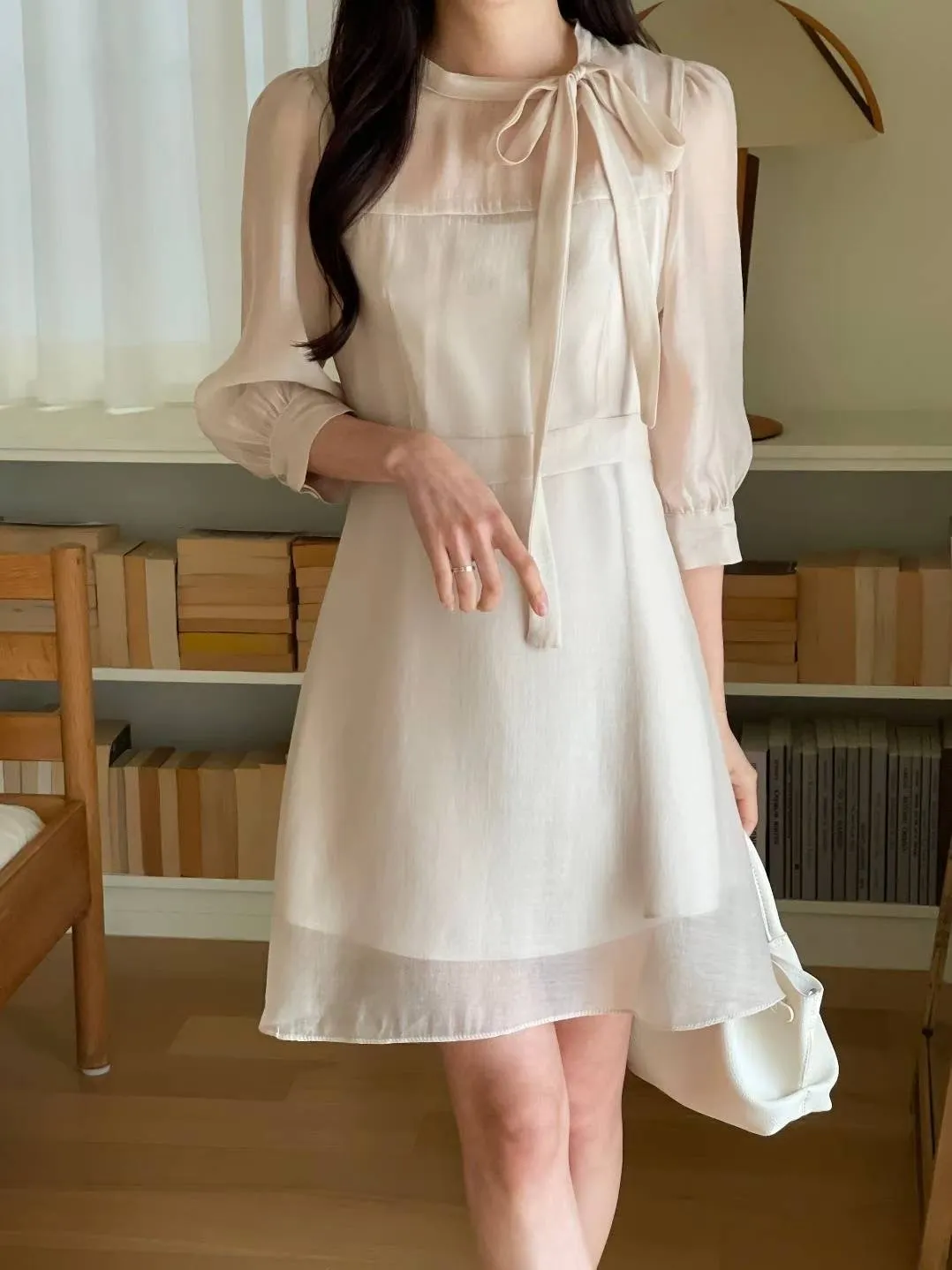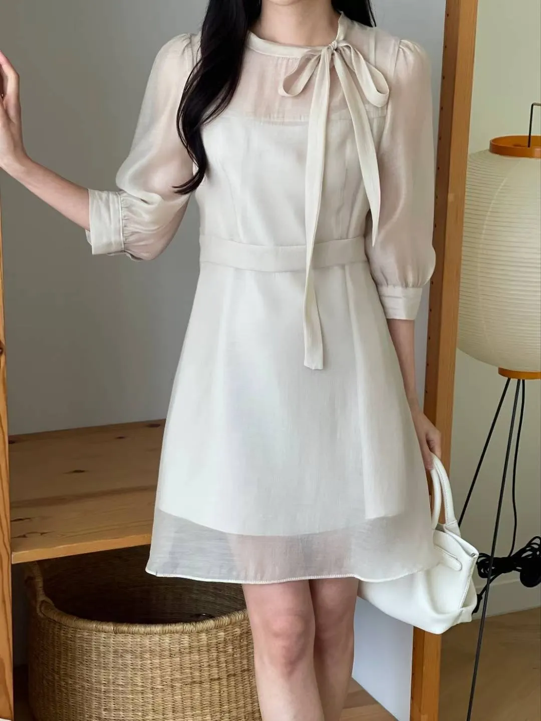 A27 0906氣質圓領綁結七分袖親膚雪紡短洋裝3色