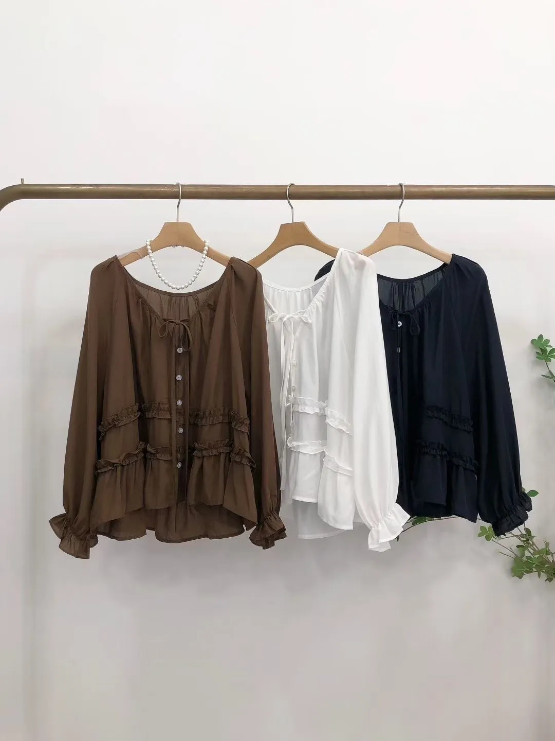 A26 0906(限量特)圓領綁帶下擺荷葉棉質上衣3色