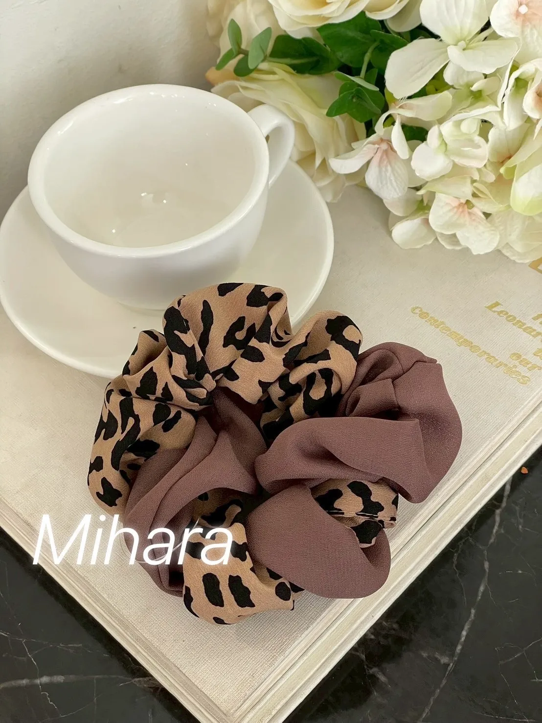 A19 0921(限量特)韓系超美立體感雙條交叉拼色咖+豹紋色系髮圈