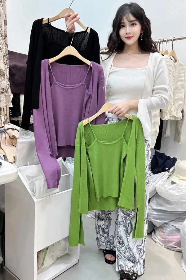 A38 0921新廠家兩件式開襟針織外套+細肩帶平口針織背心