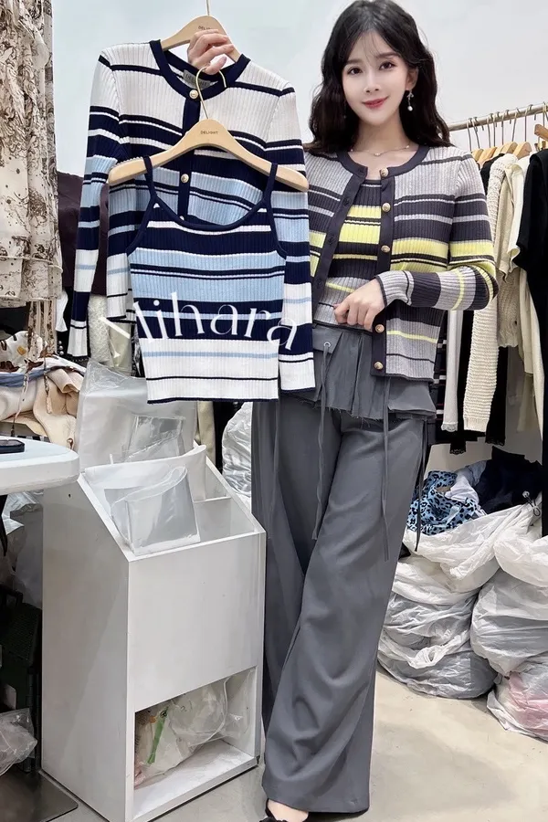 A43 0921新廠家兩件式撞色橫條排釦圓領針織外套+細肩帶撞色橫條圓領針織背心