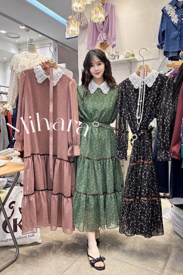 A53 0921名媛家拼接珍珠蕾絲立領蛋糕裙雪紡洋裝