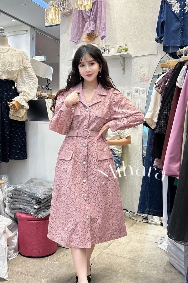 A67 0921名媛家排釦立領V領蕾絲洋裝附腰帶