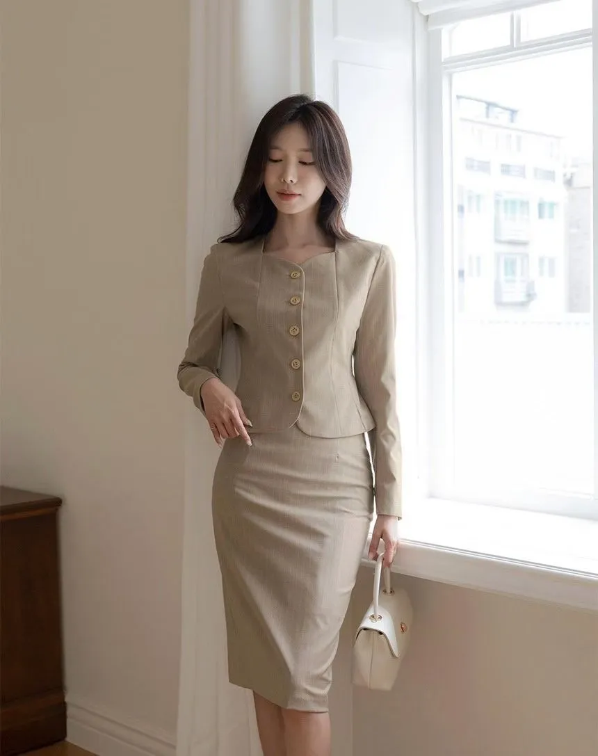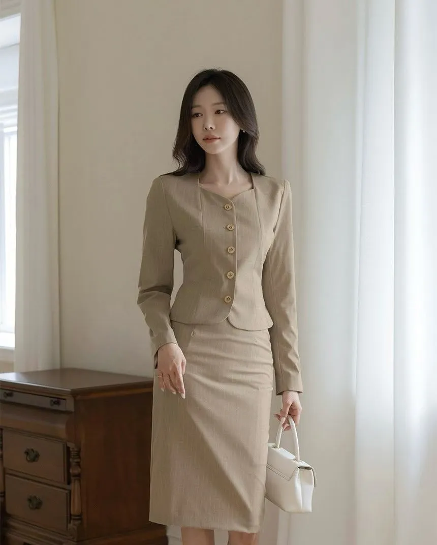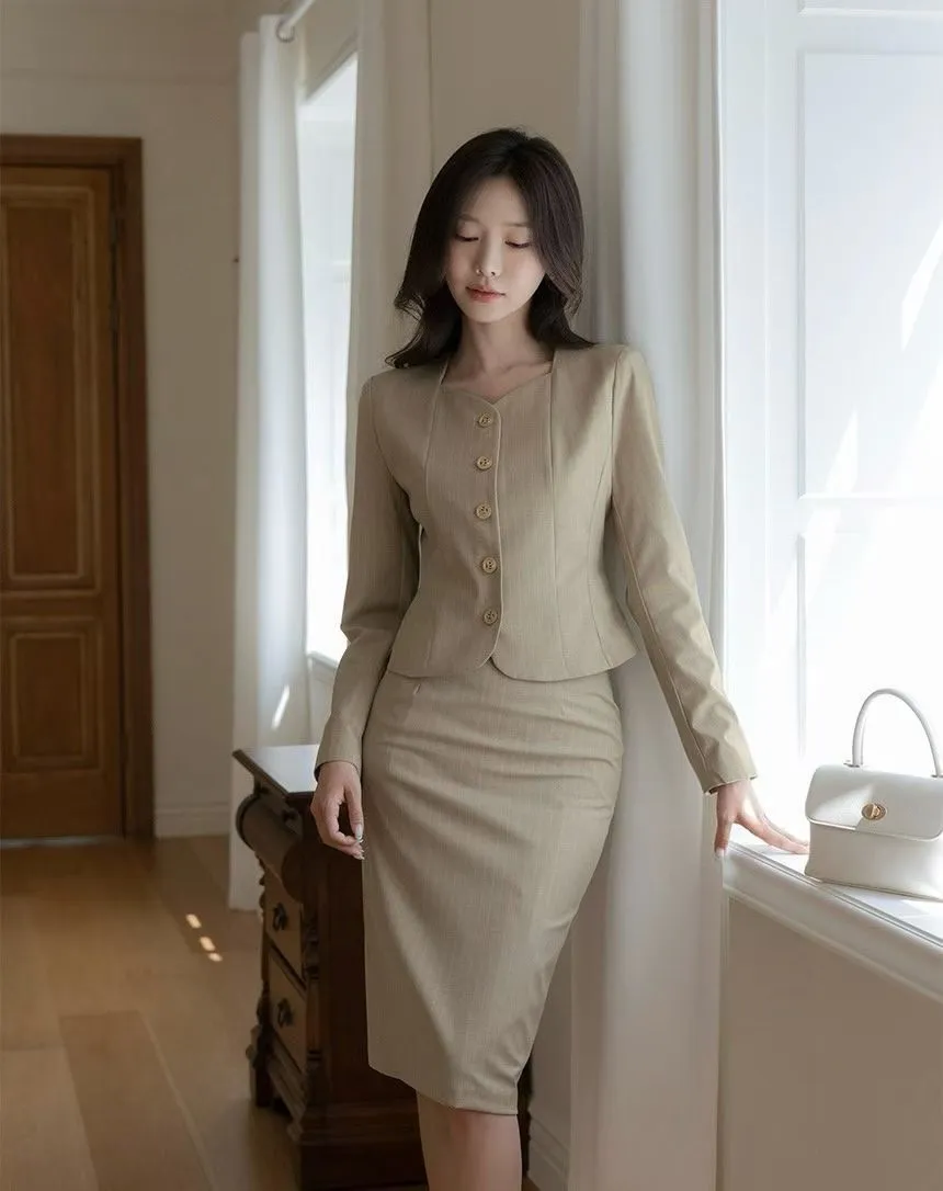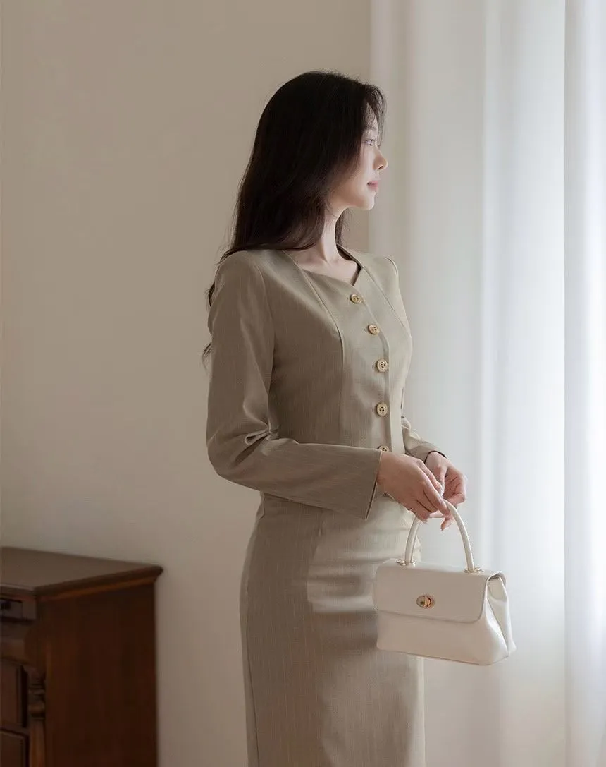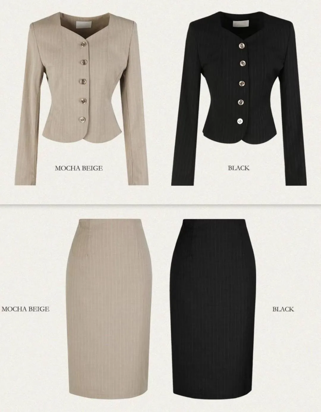 A23 1001名媛套裝家細直紋排釦V領西裝外套