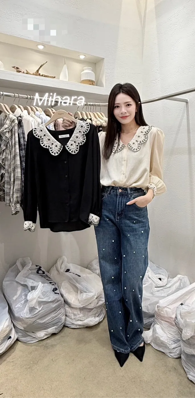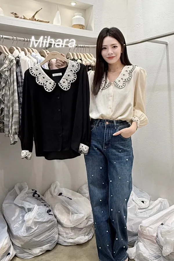 A46 1001雪紡家撞色布蕾絲小領片排釦V領麻料上衣