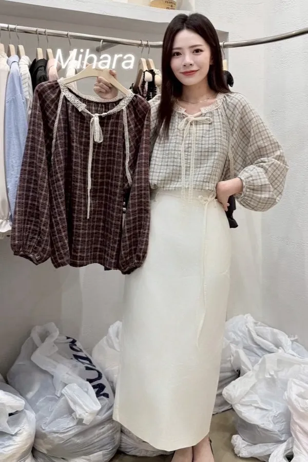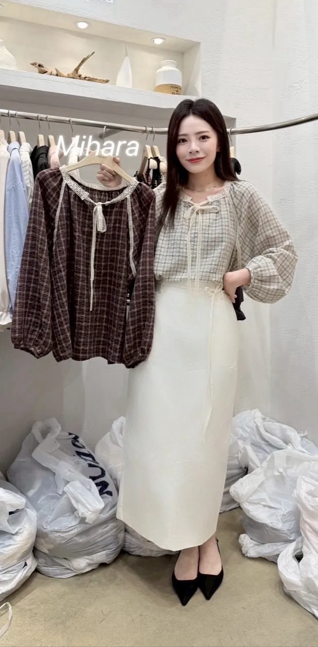 A49 1001雪紡家蝴蝶結綁帶格紋圓領上衣