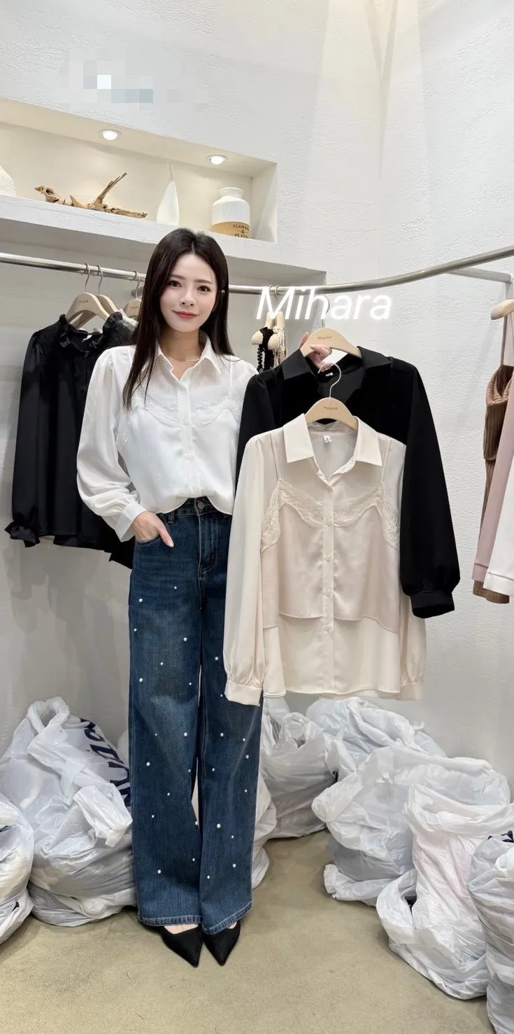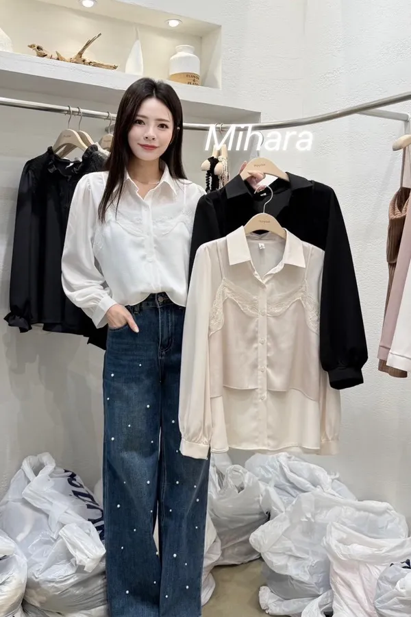 A52 1001雪紡家假兩件式拼接睫毛蕾絲背心排釦立領雪紡襯衫