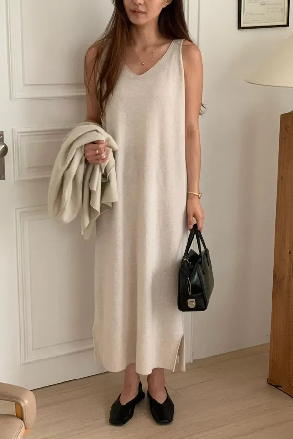 A81 1002氣質歐膩家側開衩寬肩帶V領羊毛針織背心洋裝