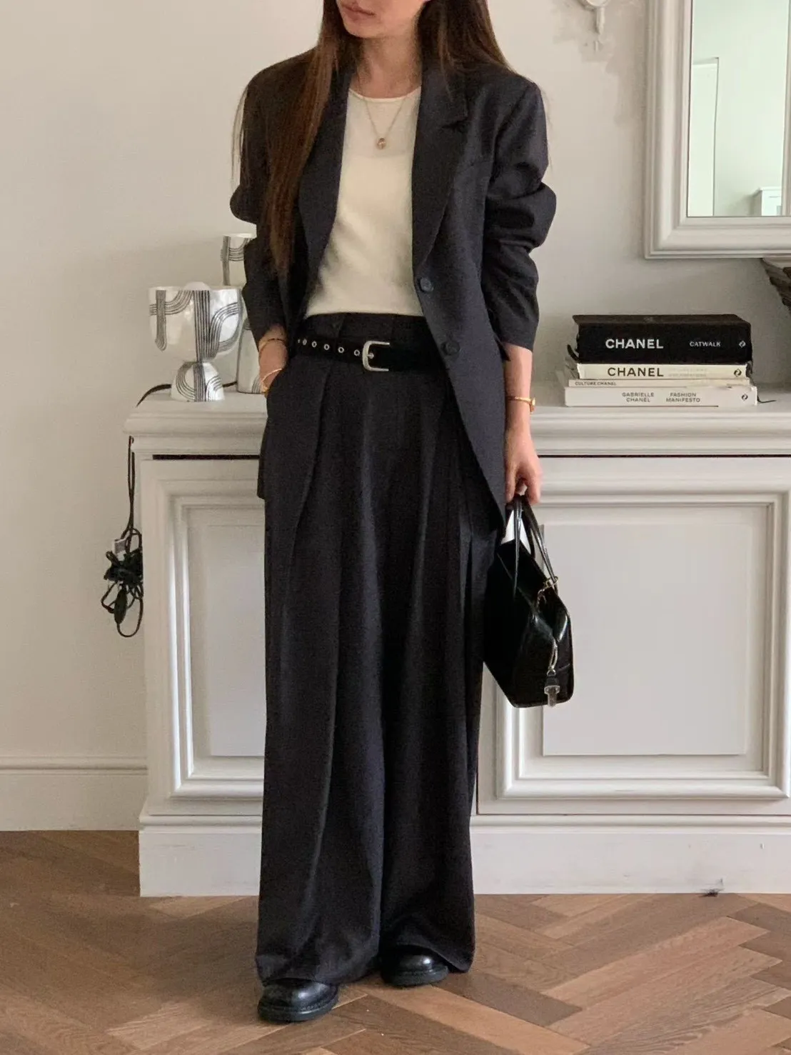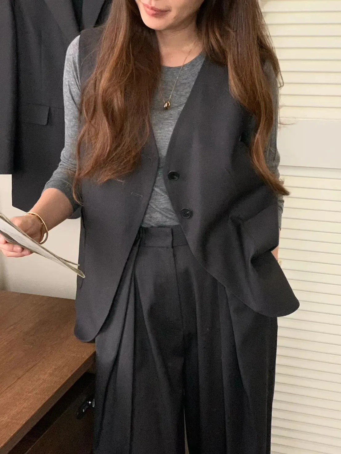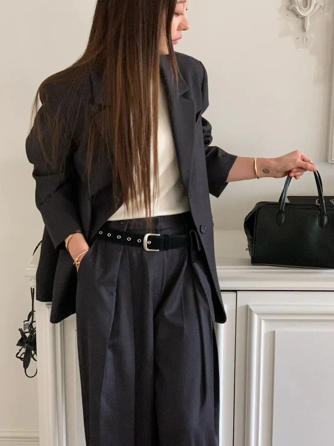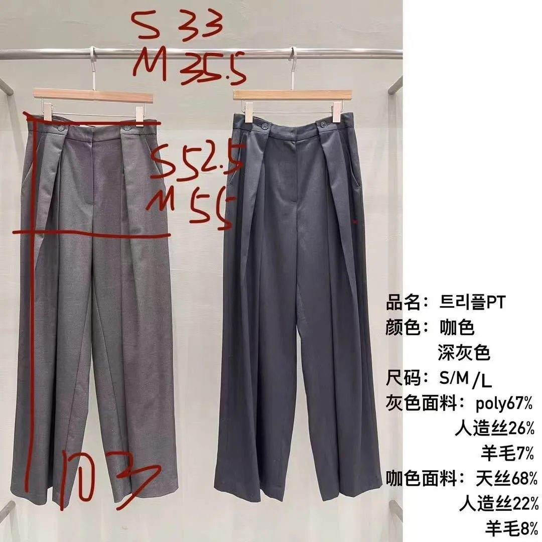 | S腰33臀52.5褲長103cm | M腰35.5臀55褲長103cm | L腰38臀57.5褲長103cm | 黑色天絲68%、人造絲22%、羊毛8%,灰色聚脂纖維67%、人造絲26%、羊毛7%,前鉤釦、拉鍊,側口袋 | Model:東海160cm/45kg(已上尺寸為<單面平量/CM>) |