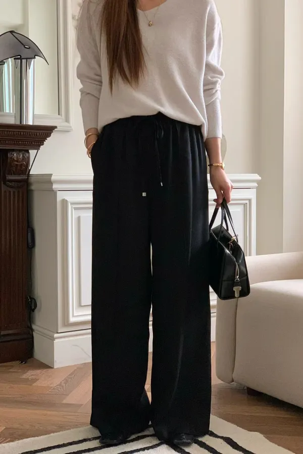 E766氣質歐膩腰鬆緊綁帶天絲羊毛寬褲