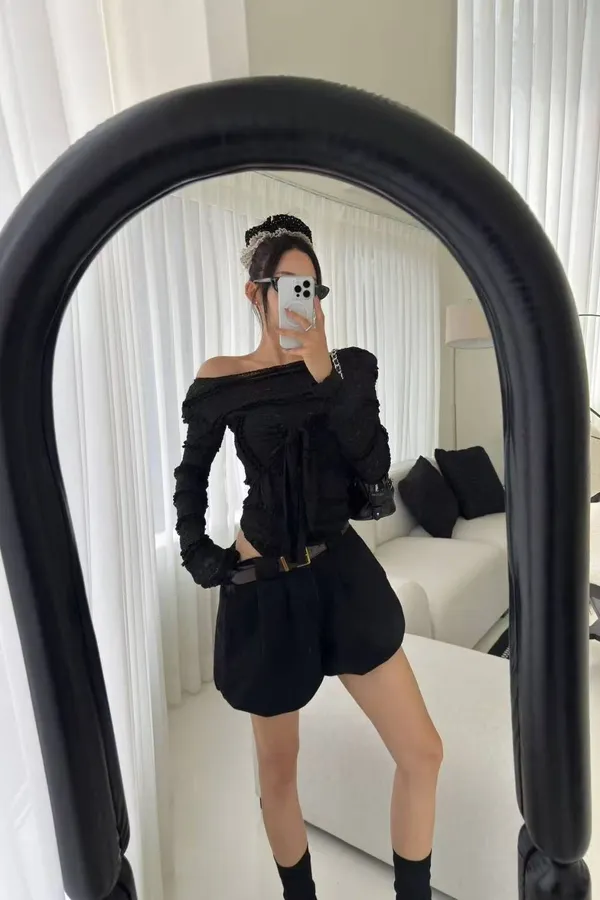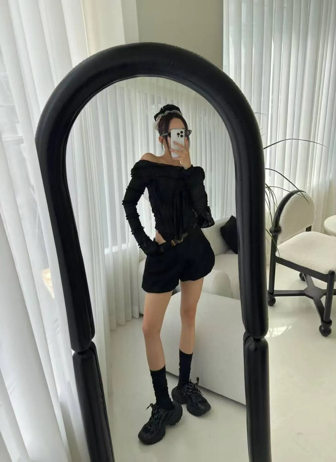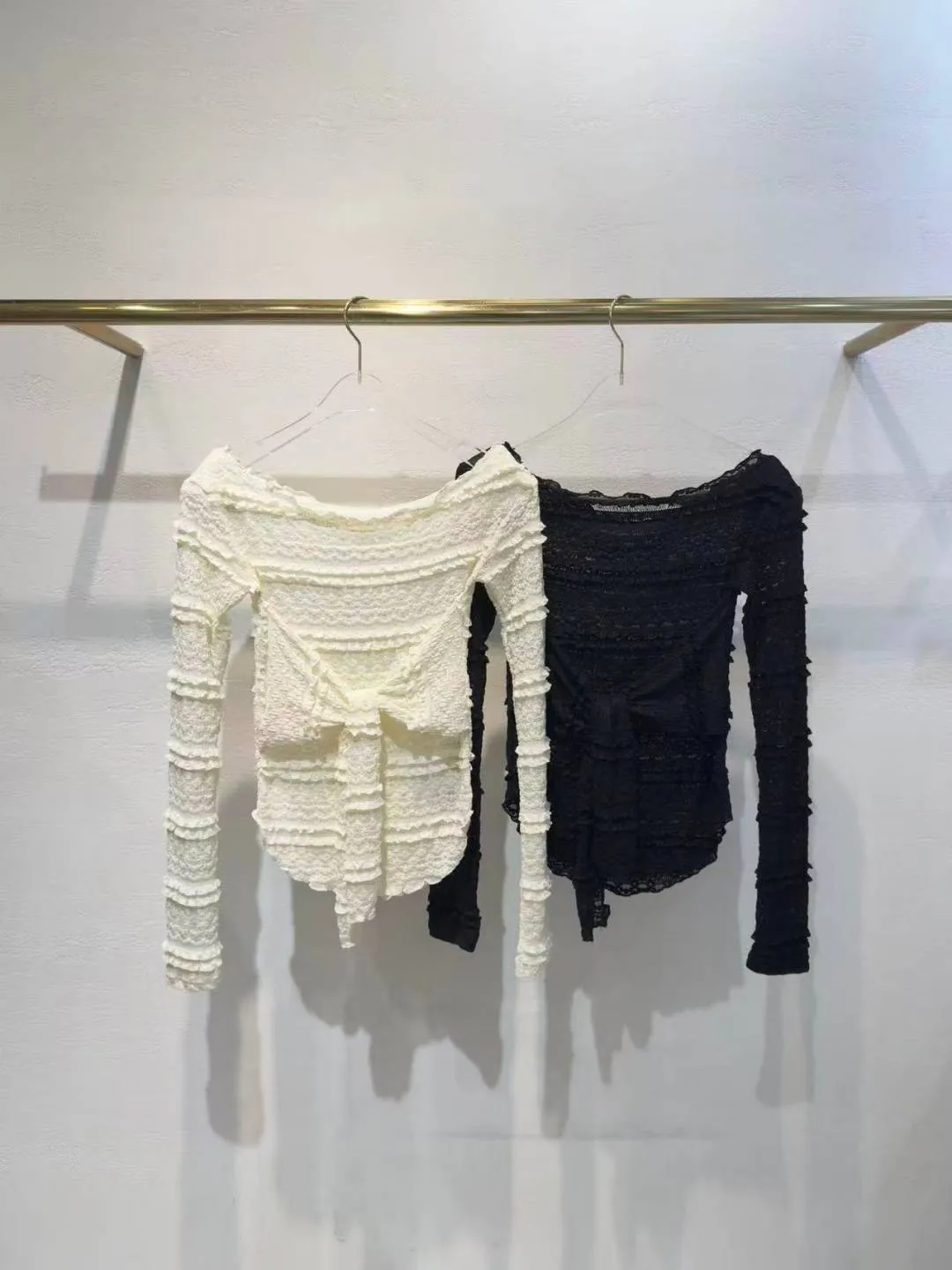 A1 1008韓妞網紅風假兩件式綁帶一字領蕾絲上衣