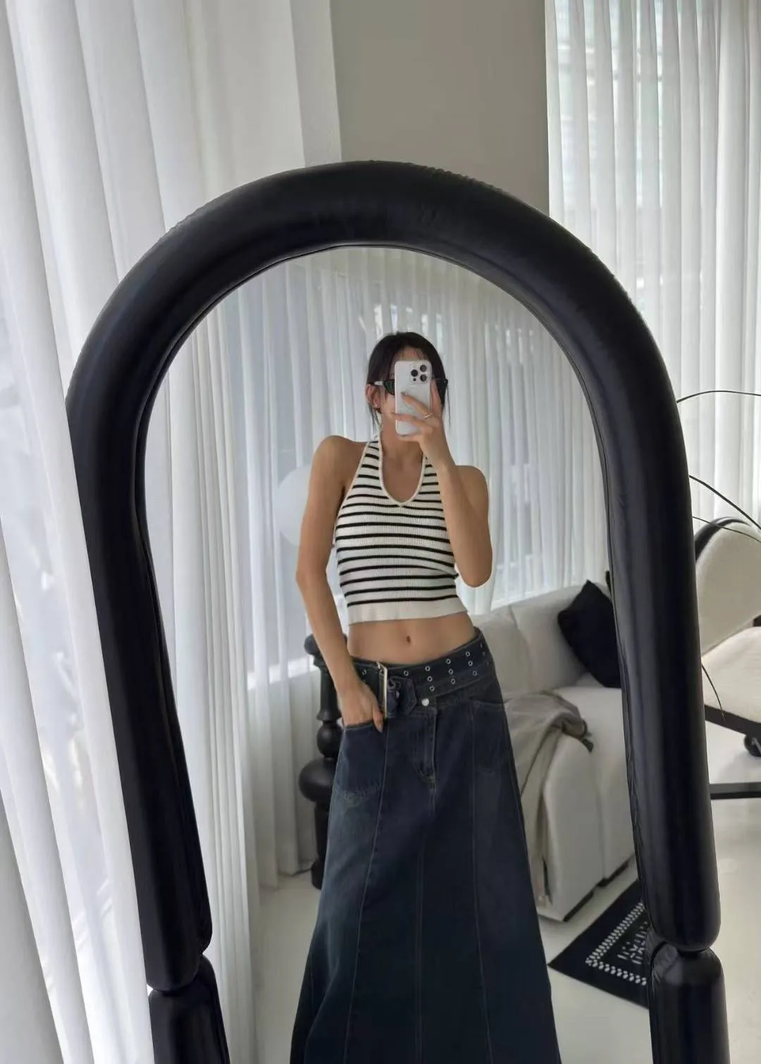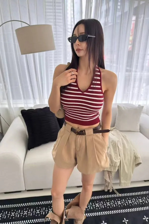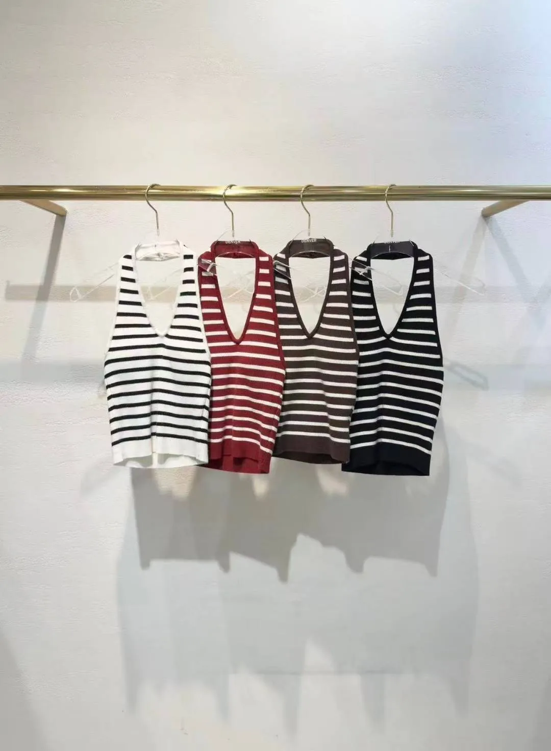 A3 1008韓妞網紅風橫條挖背繞脖針織背心
