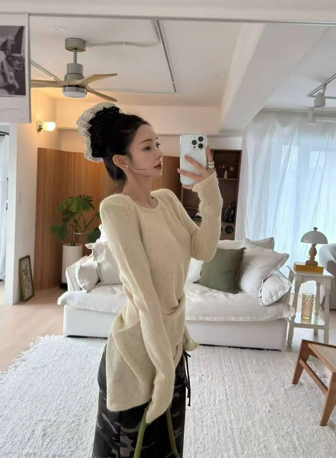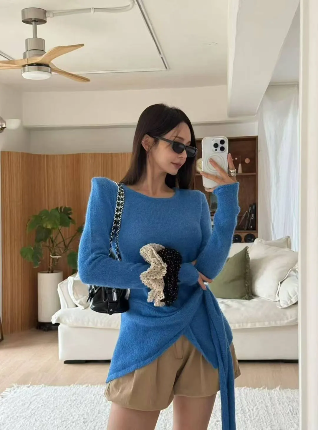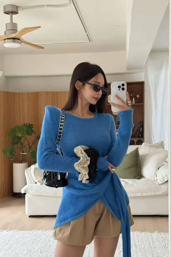 A15 1008韓妞網紅風側綁帶圓領針織上衣