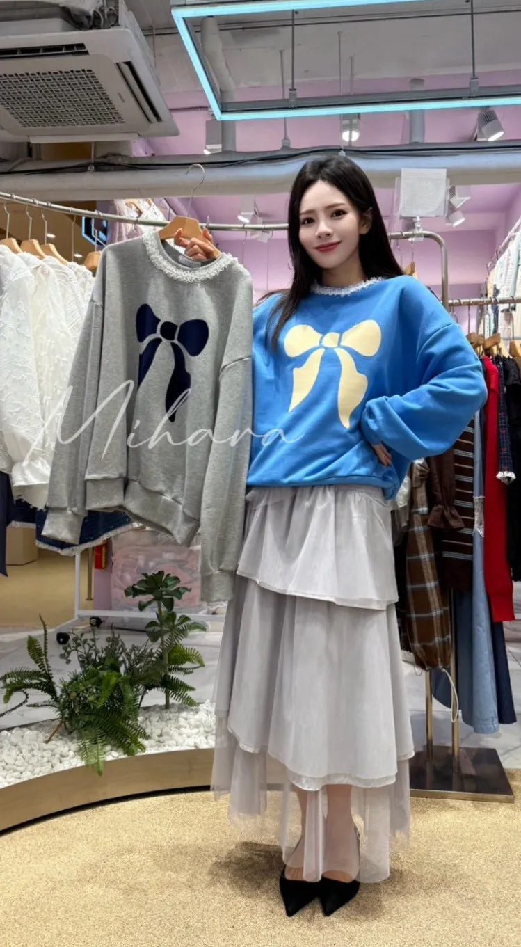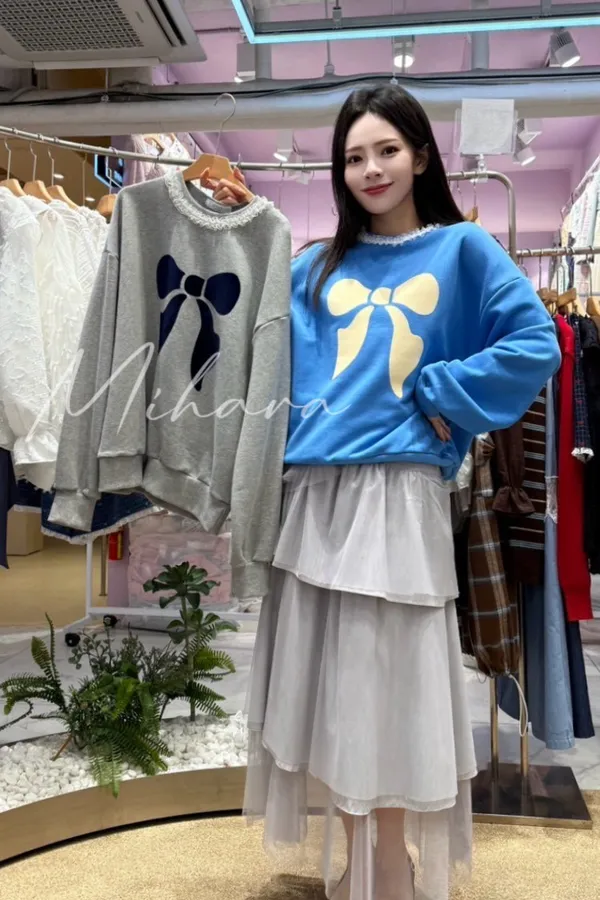 A18 1008浪漫家拼接蕾絲滾邊大蝴蝶結圓領棉質大學T
