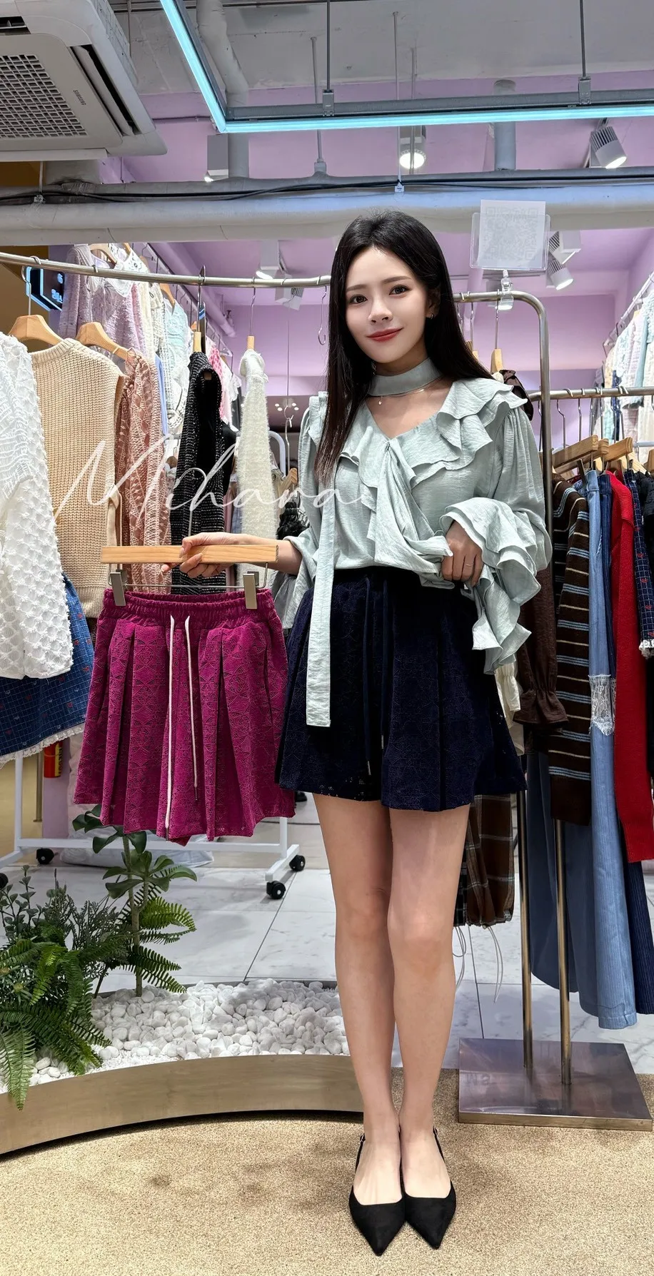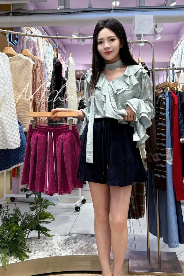A24 1008浪漫家抽繩綁帶寬百褶簍空A字短褲裙
