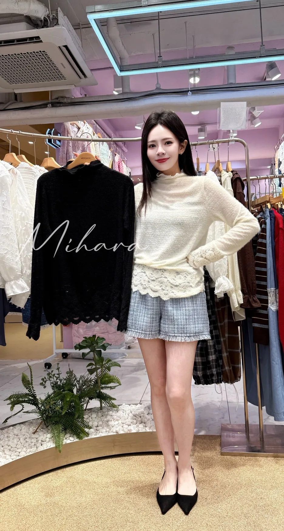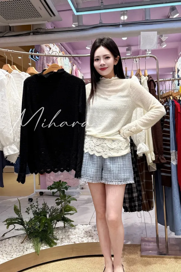 A30 1008浪漫家拼接蕾絲木耳滾邊半領上衣