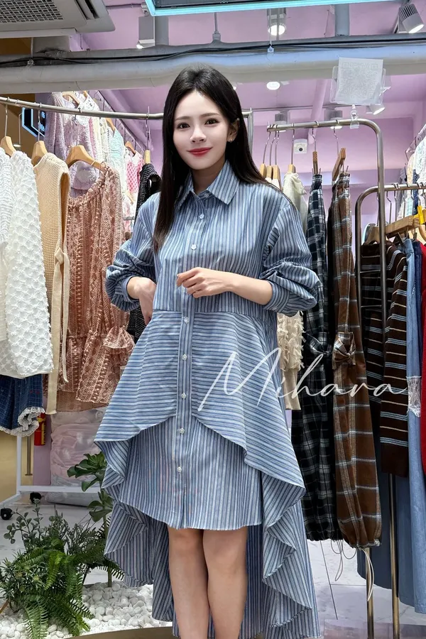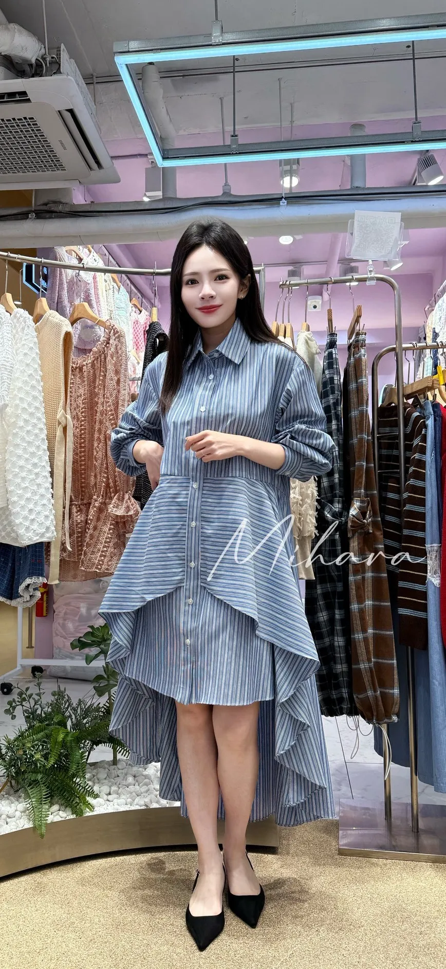 A31 1008浪漫家條紋排釦立領不規則襯衫洋裝