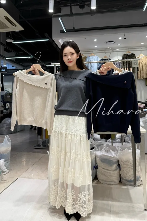 A36 1009甜甜CP蕾絲場拼接蕾絲大翻領帆船領棉質針織上衣