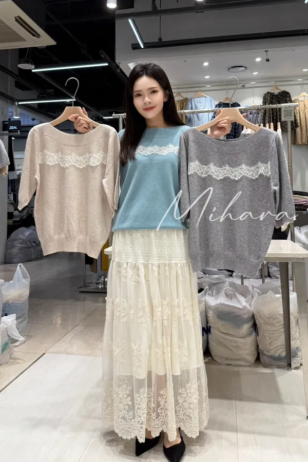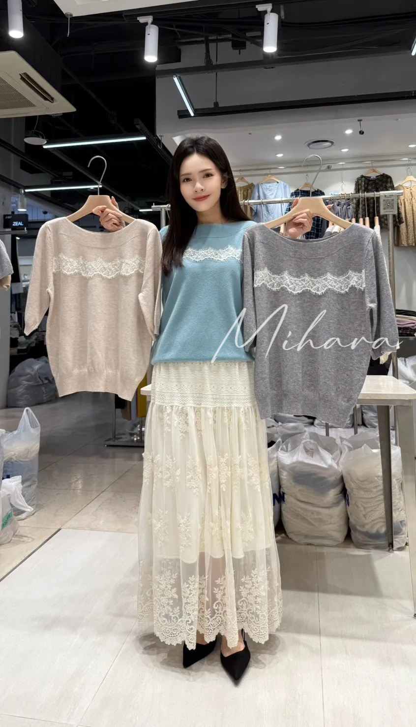 A37 1009甜甜CP蕾絲場拼接睫毛蕾絲帆船領棉質針織上衣