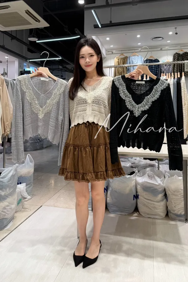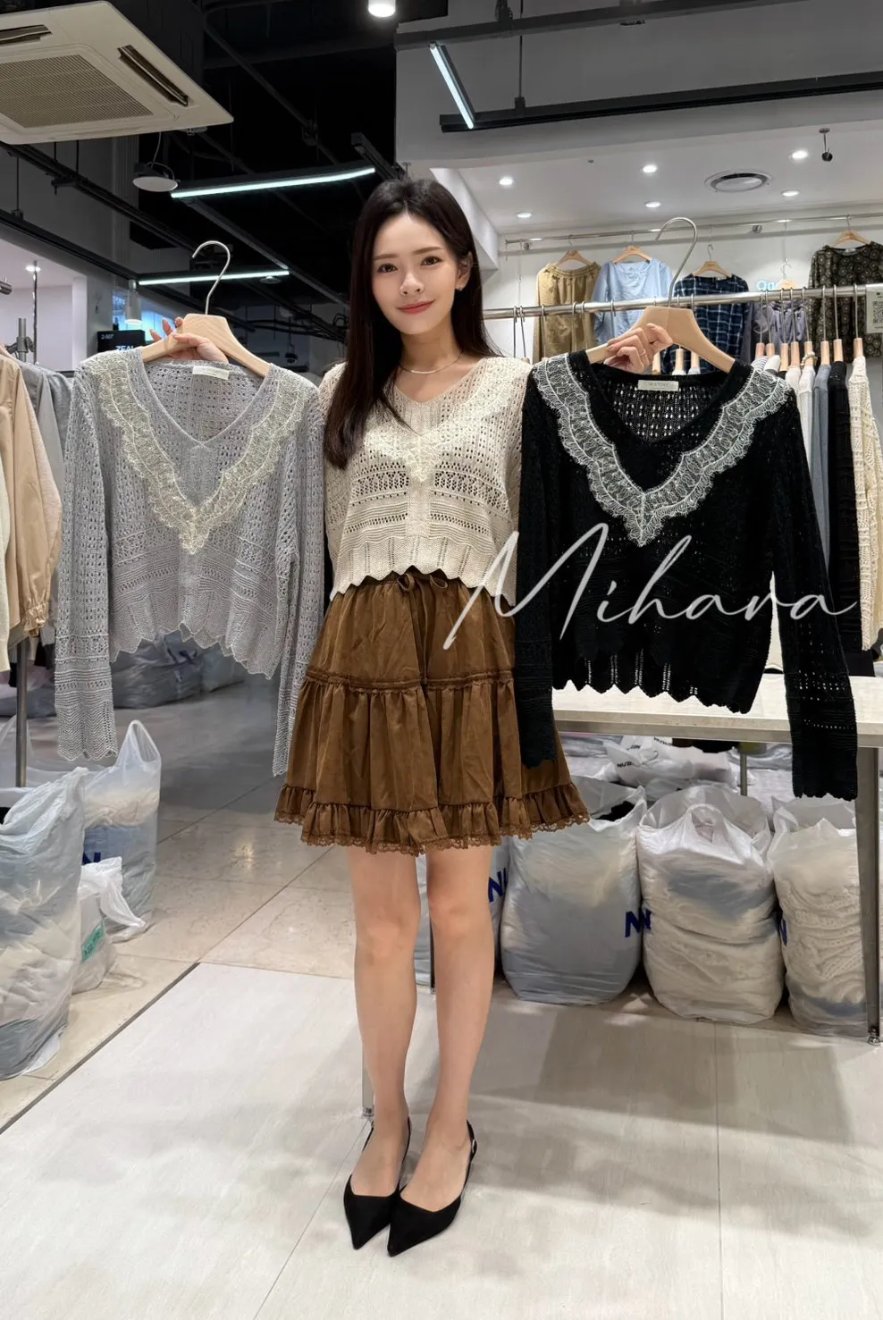 A43 1009甜甜CP蕾絲場拼接睫毛蕾絲V領洞洞針織上衣