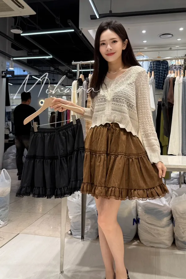 A44 1009甜甜CP蕾絲場拼接蕾絲滾邊抽繩綁帶蛋糕短褲裙