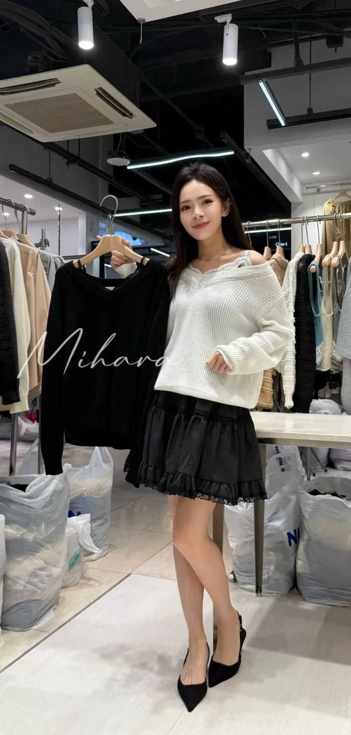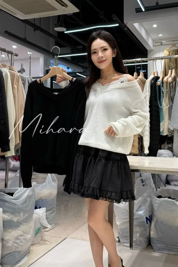 A45 1009甜甜CP蕾絲場拼接布蕾絲肩帶一字領針織上衣
