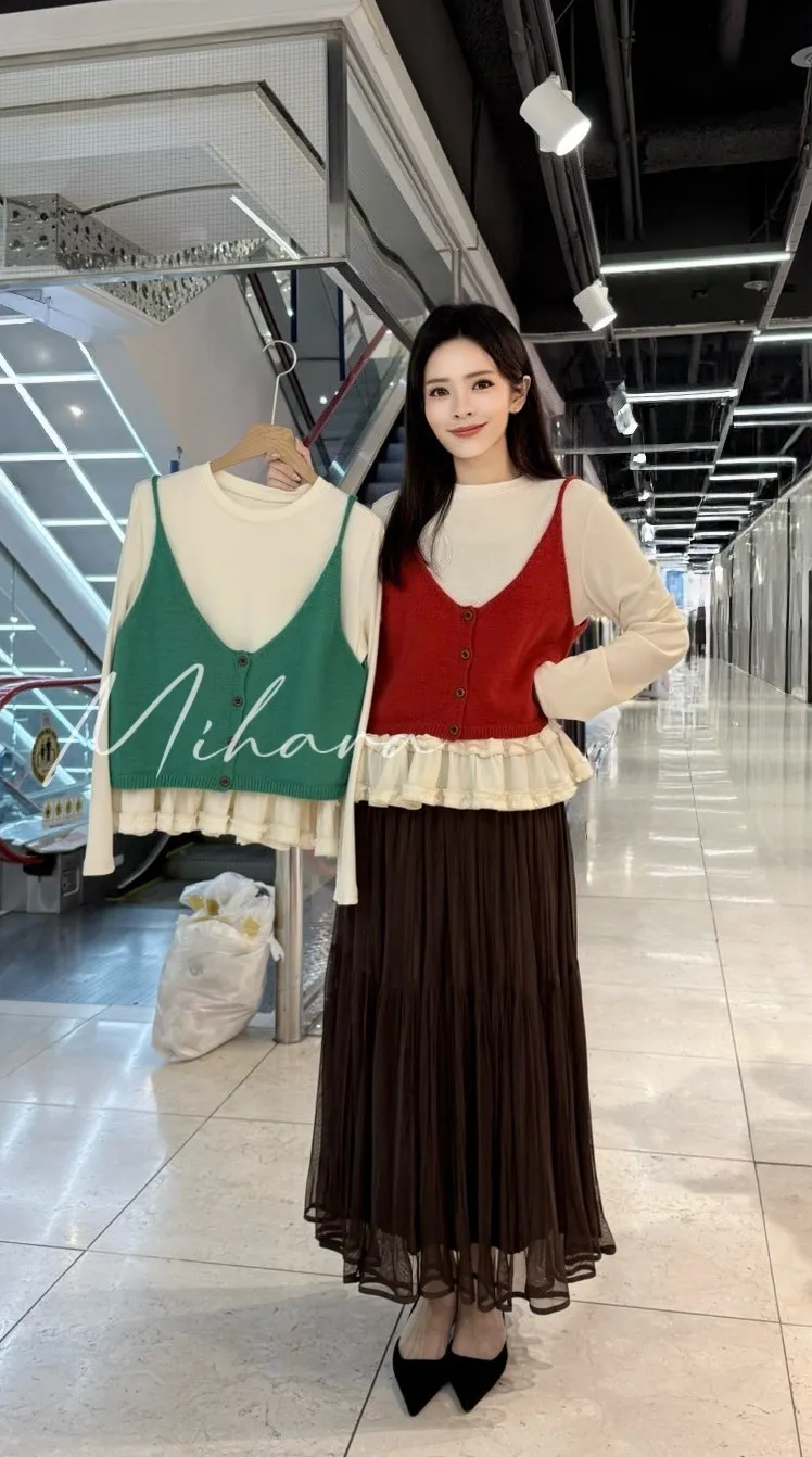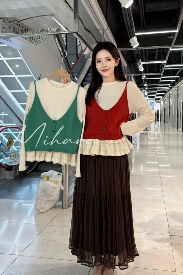 A49 1009CP甜甜家兩件式排釦細肩帶大V領背心+拼接蕾絲滾邊圓領上衣