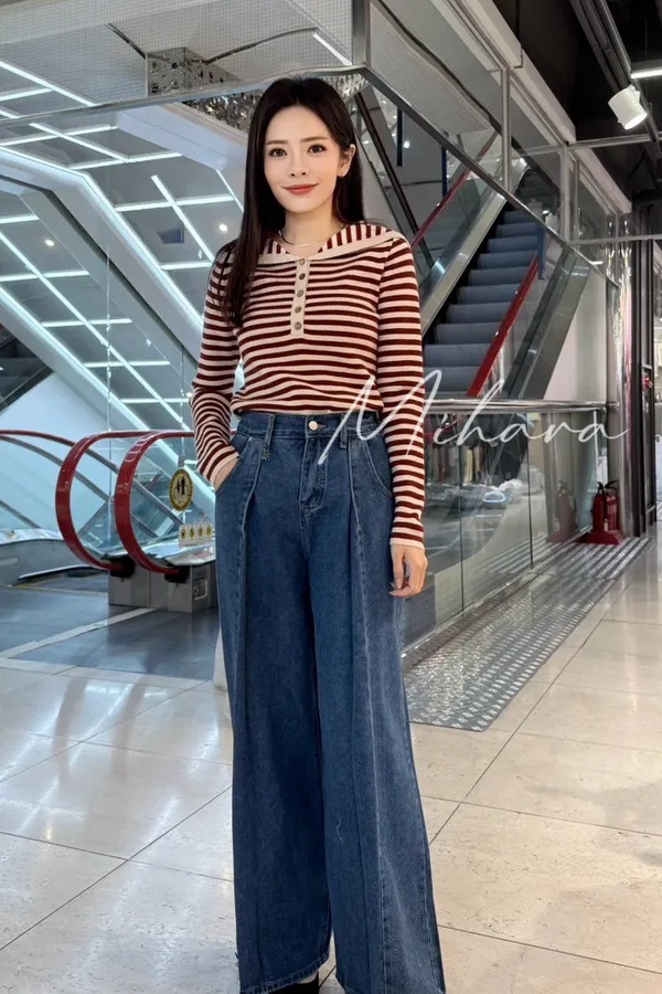 A52 1009CP甜甜家橫條排釦大領片V領棉質針織上衣