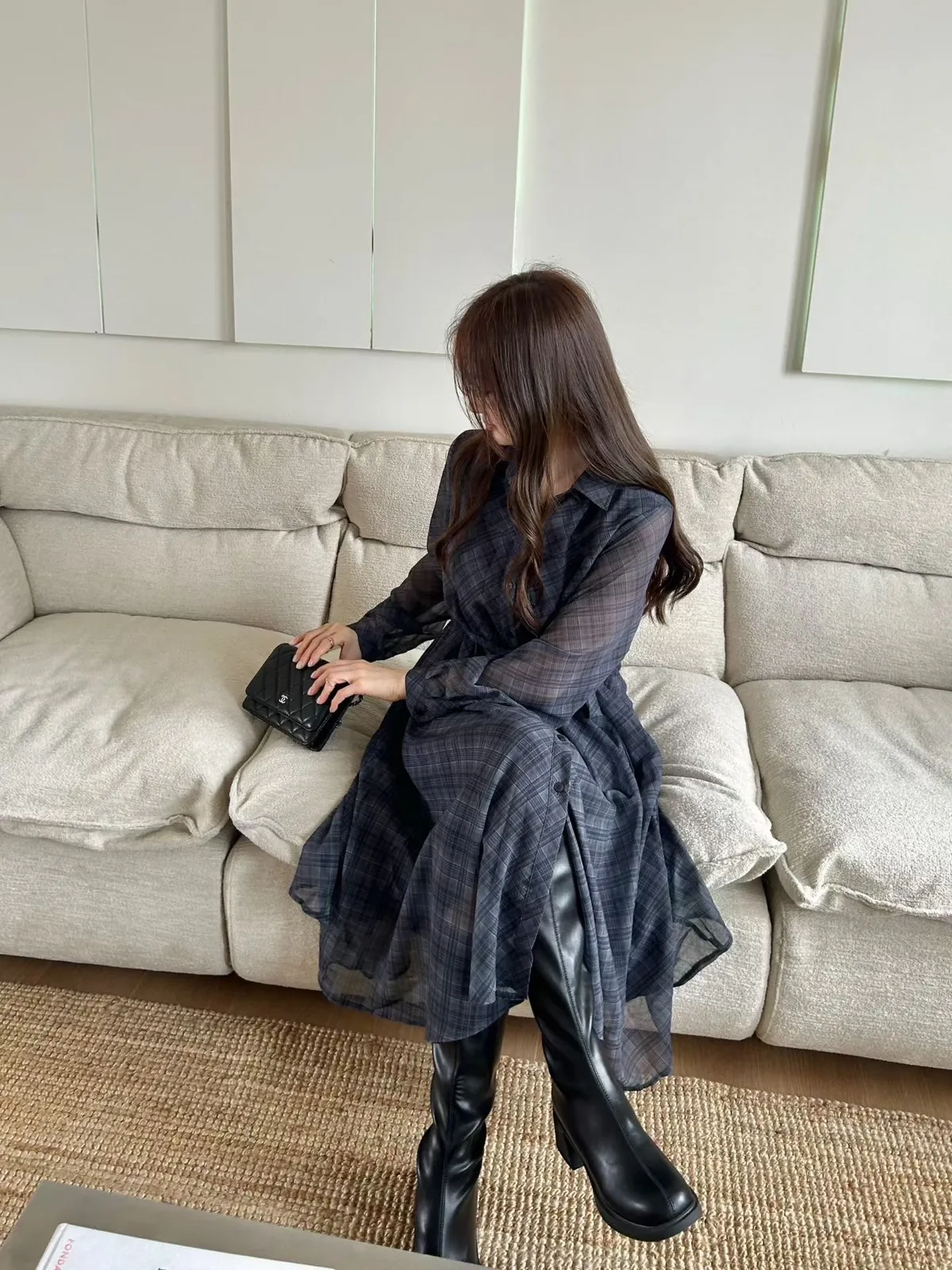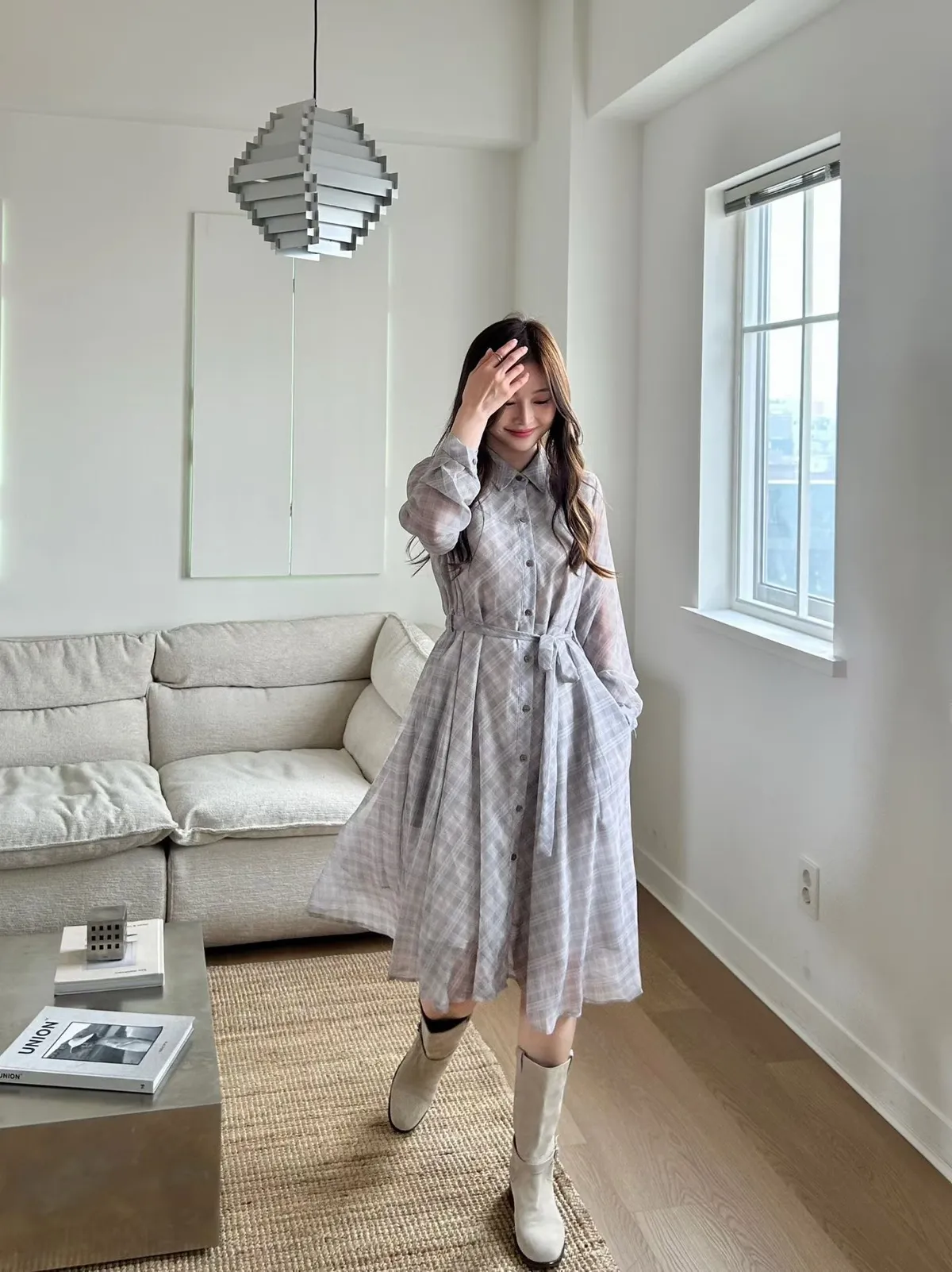 A3 1012浪漫翻領格紋雪紡綁帶洋裝3色