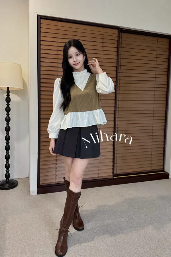 A4 1012荷葉領假兩件拼接上衣