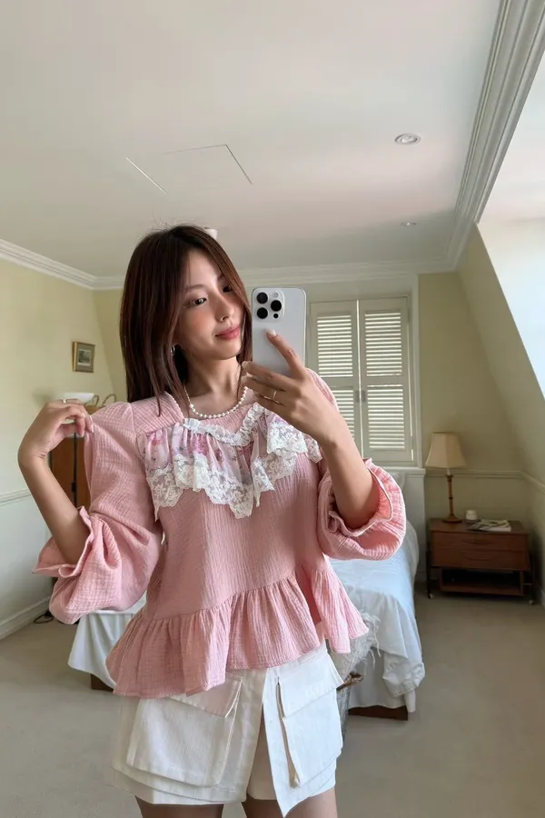 A6 1014素希歐膩家拼接雪紡蕾絲梯形領純棉上衣