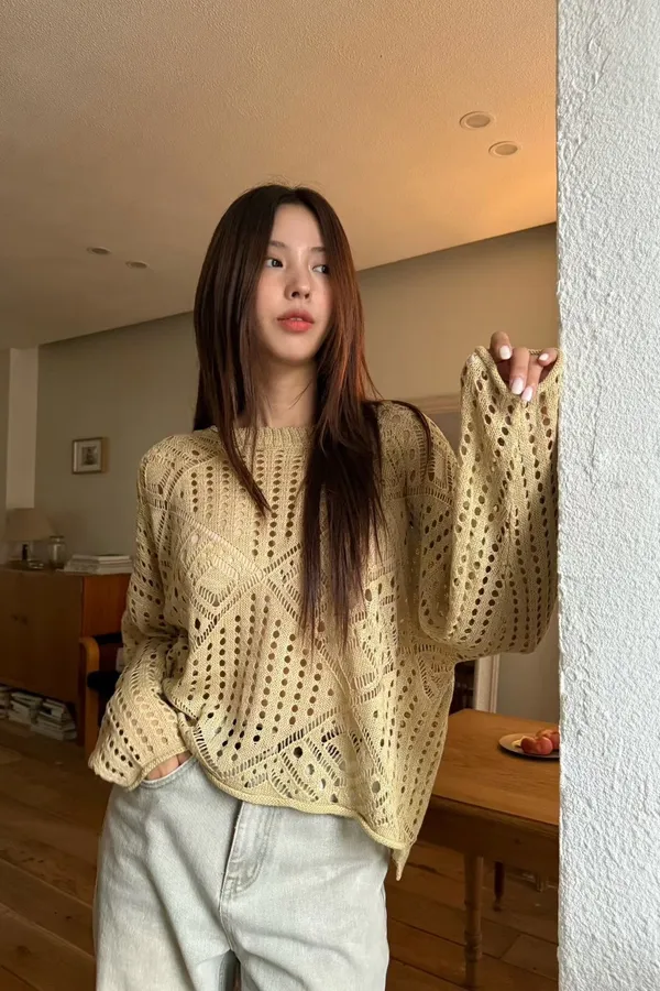 A12 1014素希歐膩家菱格紋圓領洞洞罩衫