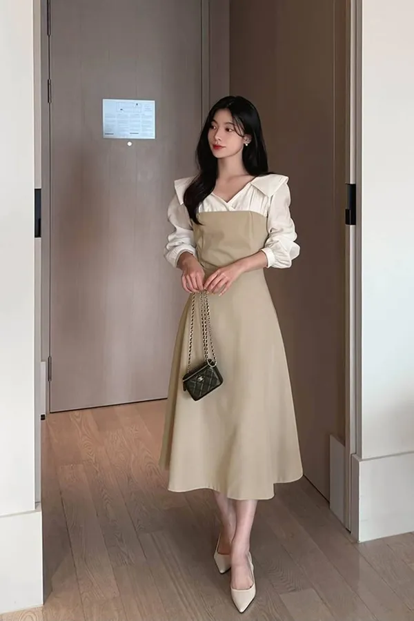 E108 1015名媛洋裝家拼接異材質翻領V領襯衫長洋裝(S/M)