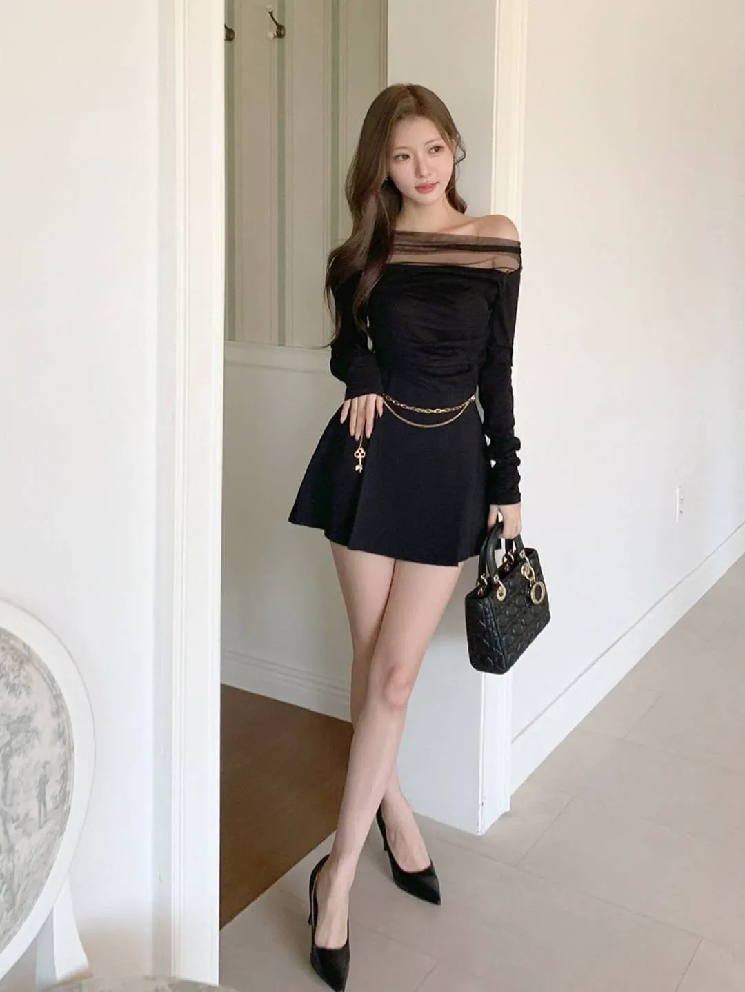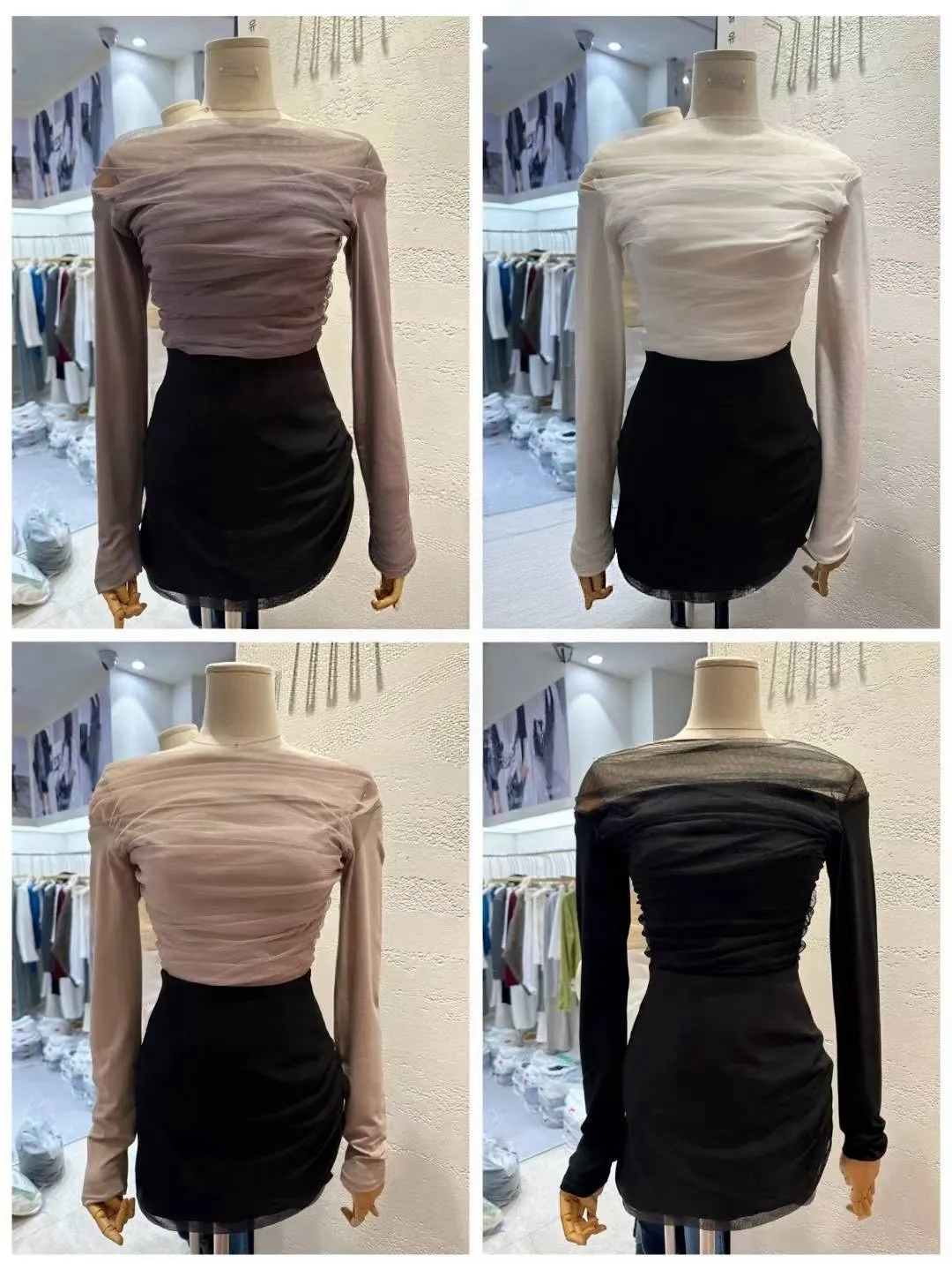 A26 1015名媛洋裝家拼接網紗垂領可拉一字領上衣