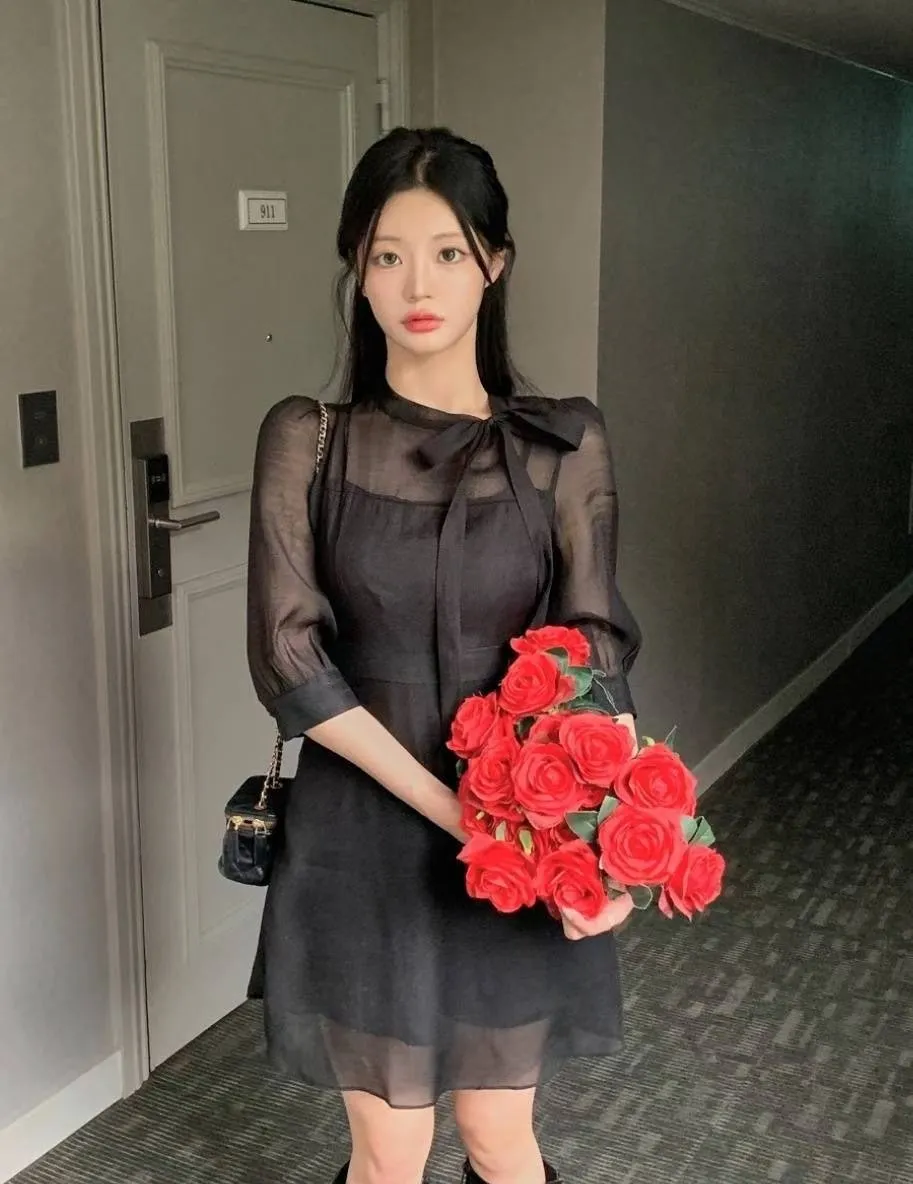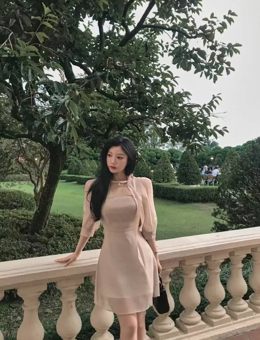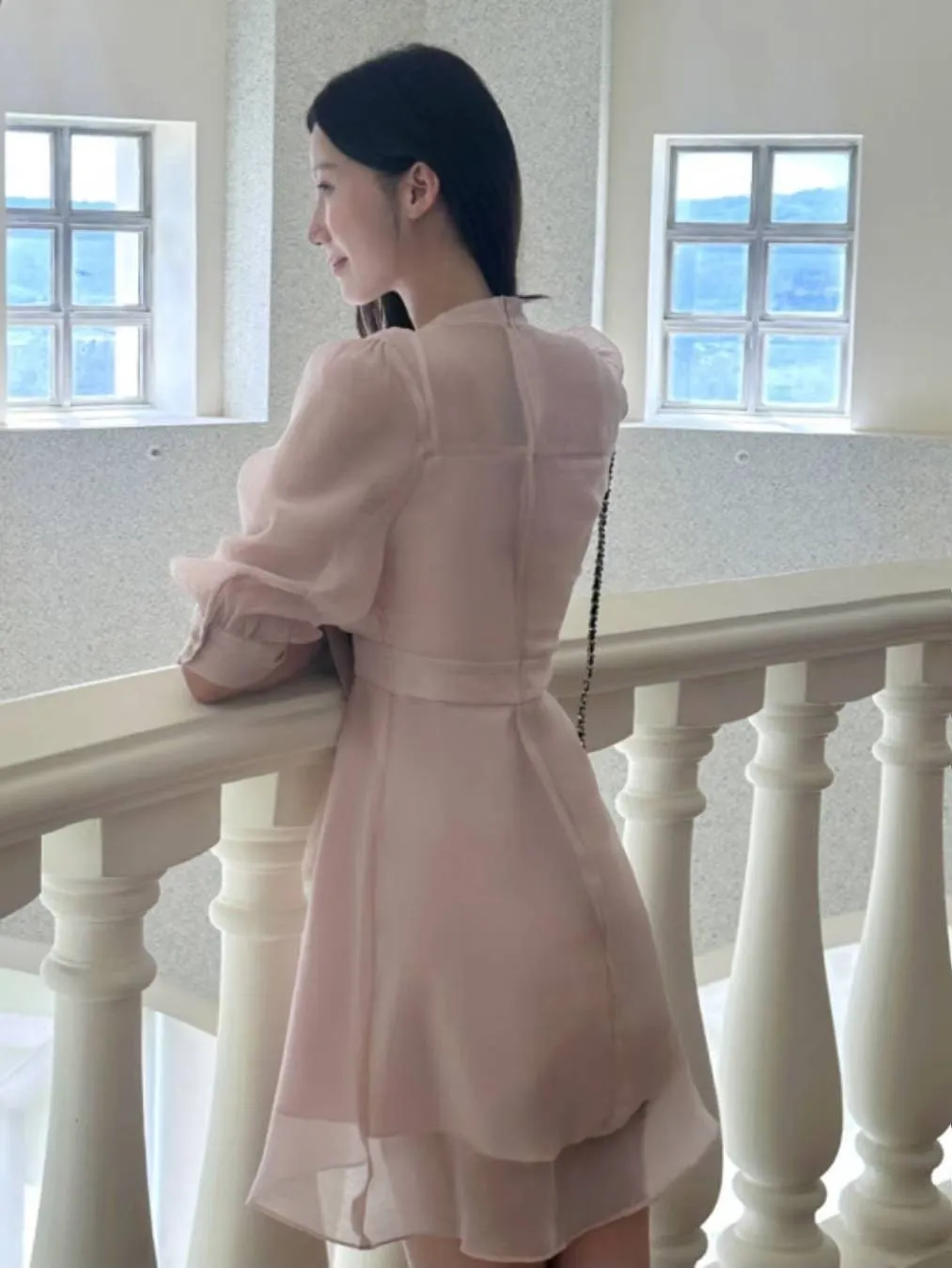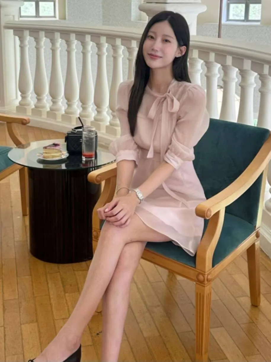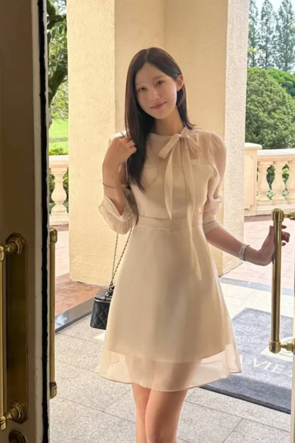 A31 1015名媛洋裝家側蝴蝶結綁帶圓領雪紡短洋裝