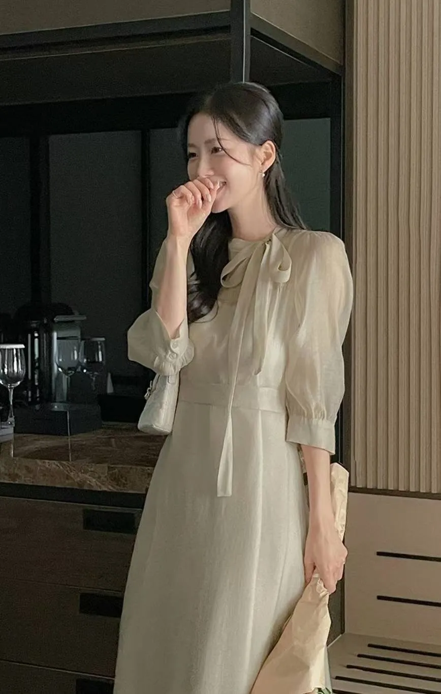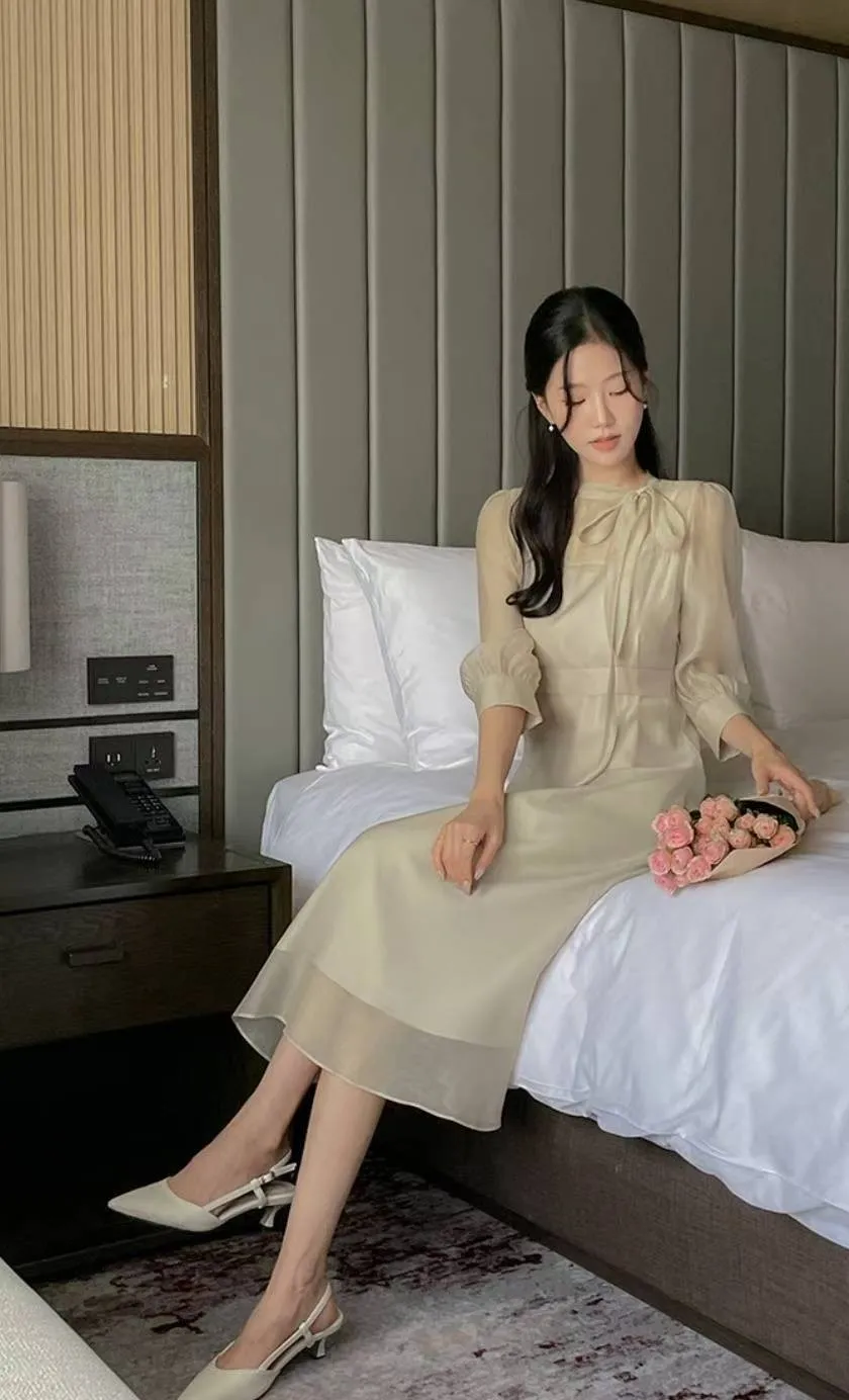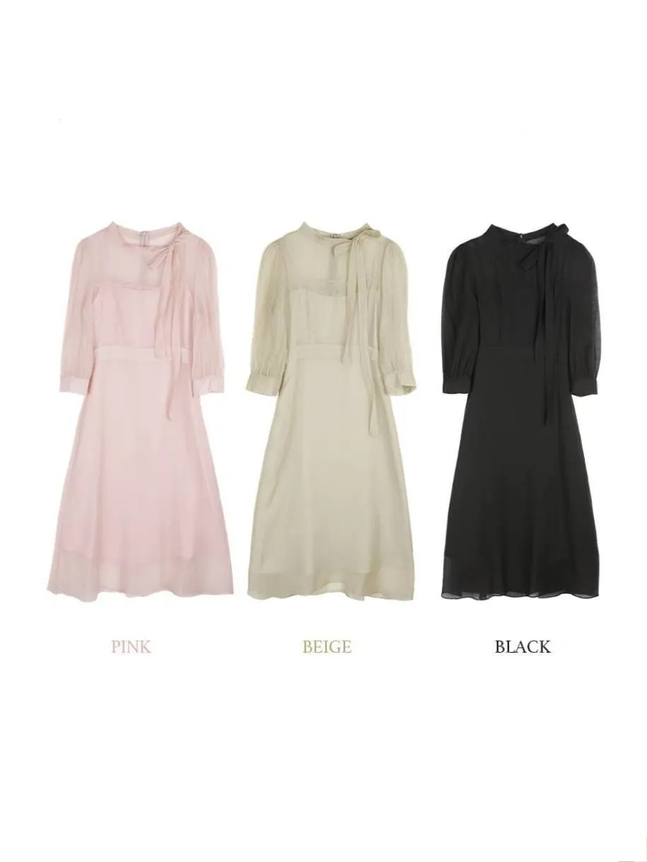A32 1015名媛洋裝家側蝴蝶結綁帶圓領雪紡長洋裝