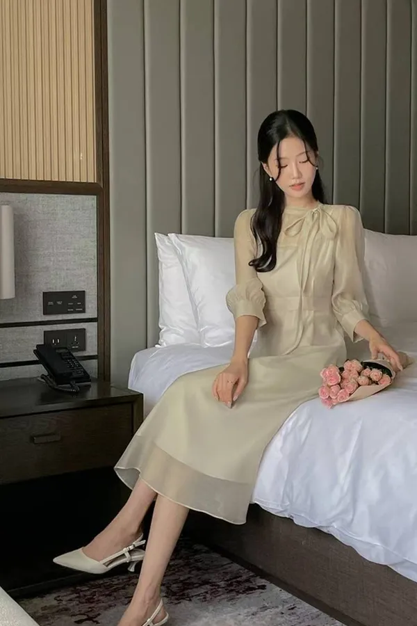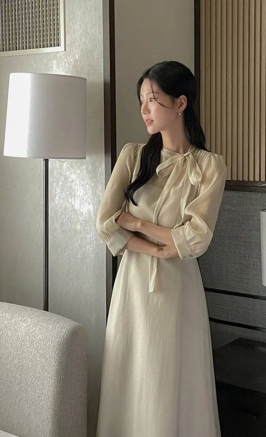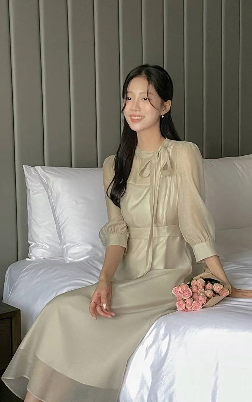A32 1015名媛洋裝家側蝴蝶結綁帶圓領雪紡長洋裝