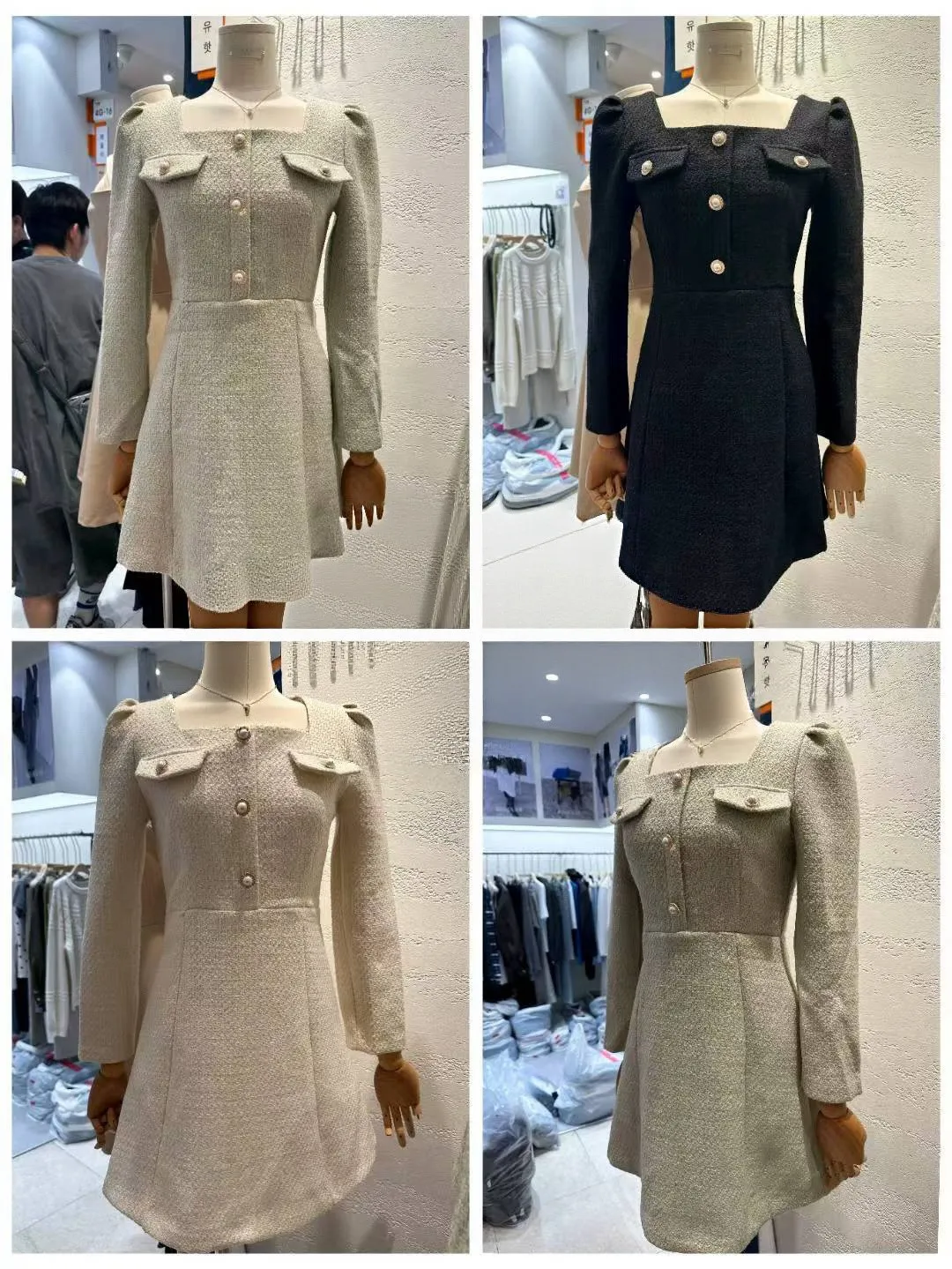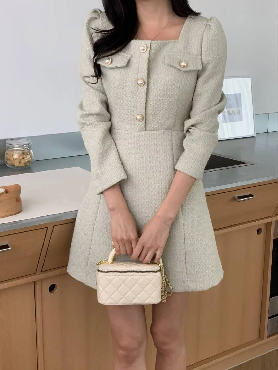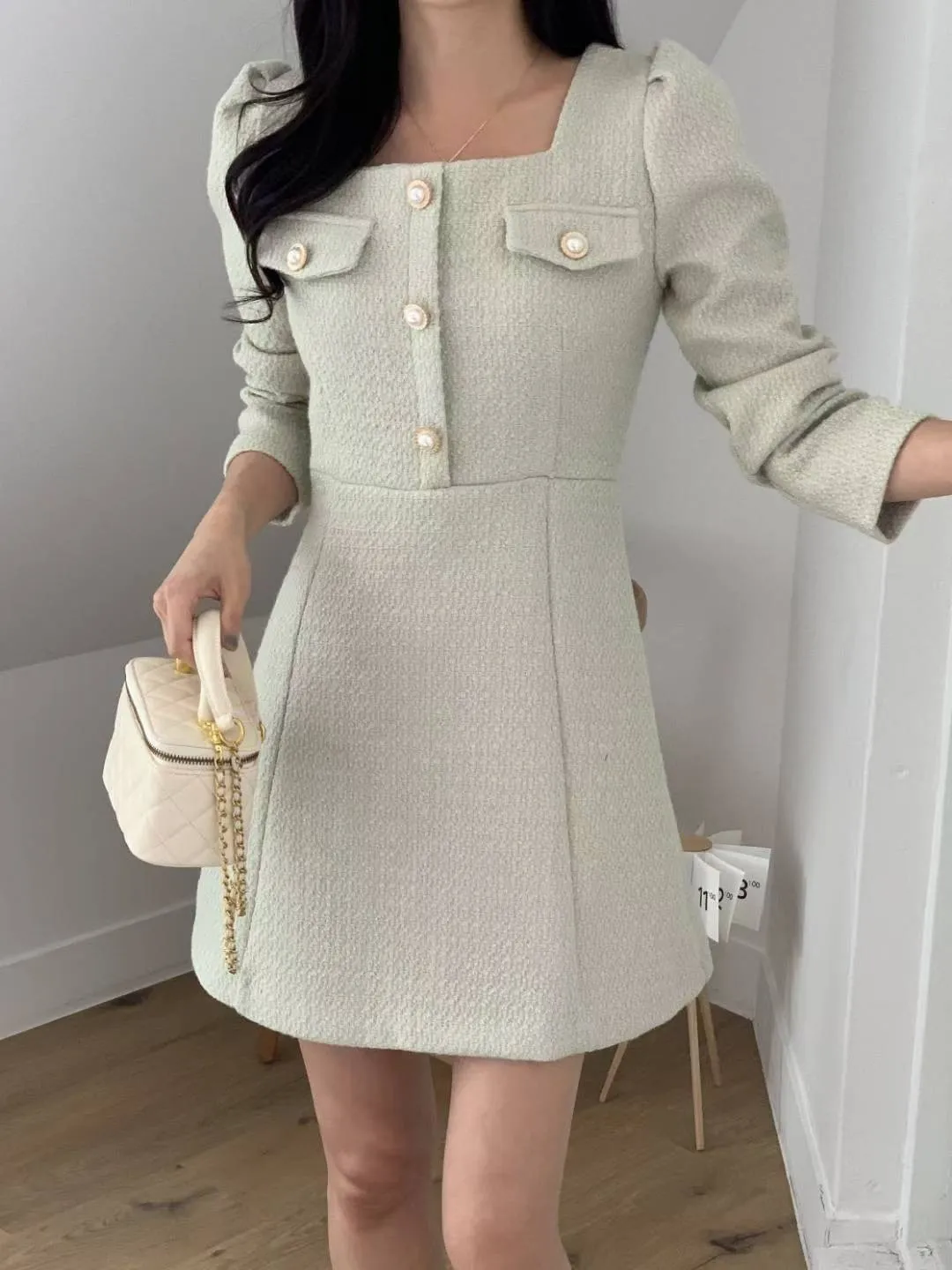A35 1015名媛洋裝家排釦方領胸前假口袋小香洋裝