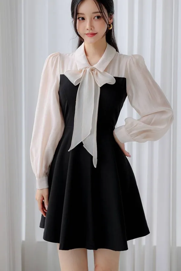 A38 1015名媛洋裝家拼接異材質立領襯衫洋裝附綁帶