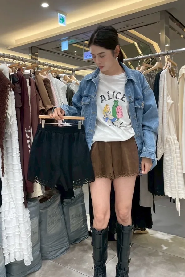 A67 1015高檔名模歐膩家下擺簍空燒花麂皮短褲