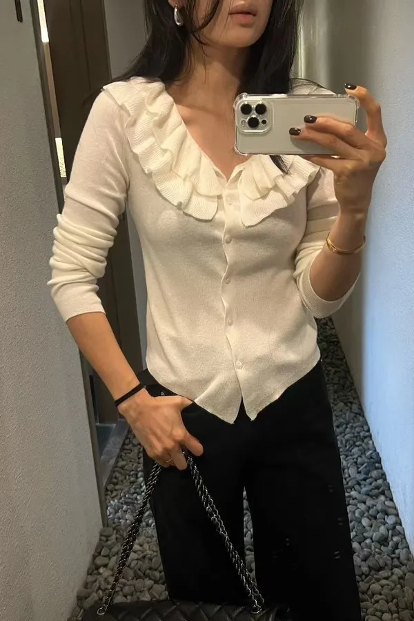 A72 1015高檔名模歐膩家荷葉滾邊排釦V領混羊毛上衣