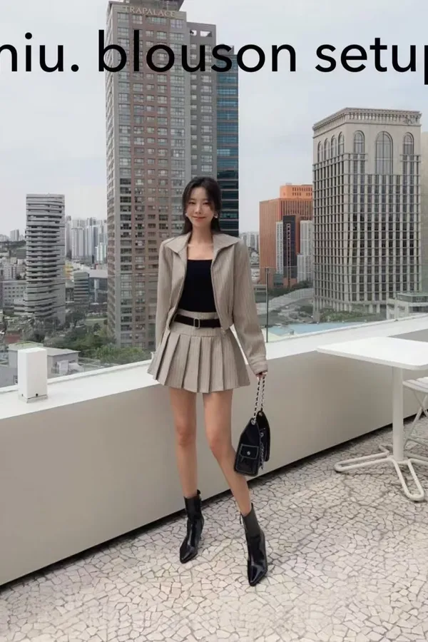1019翻領直紋外套+褲裙(set)
