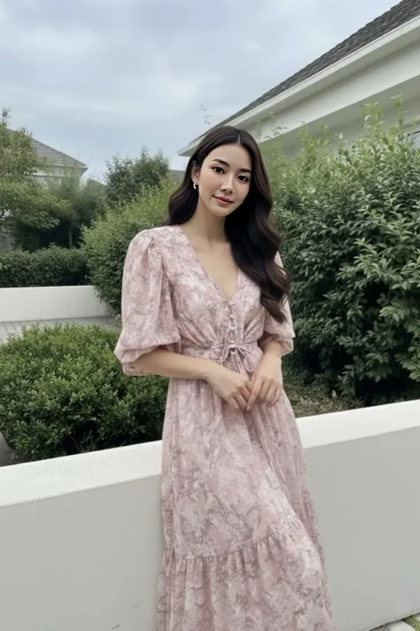 A13 1019仙女V領澎袖碎花雪紡洋裝2色