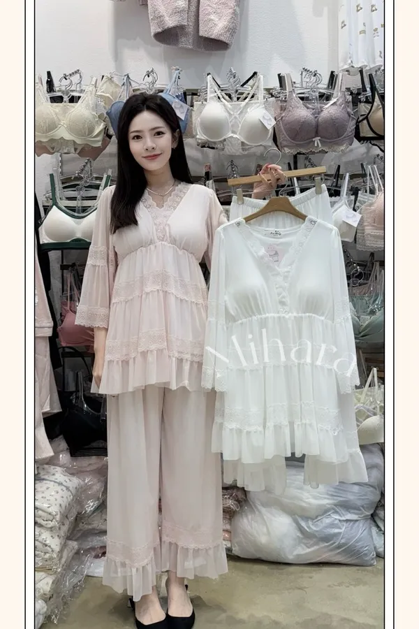 A42 1019甜美睡衣家雕花蕾絲V領胸墊睡衣+睡褲(SET)